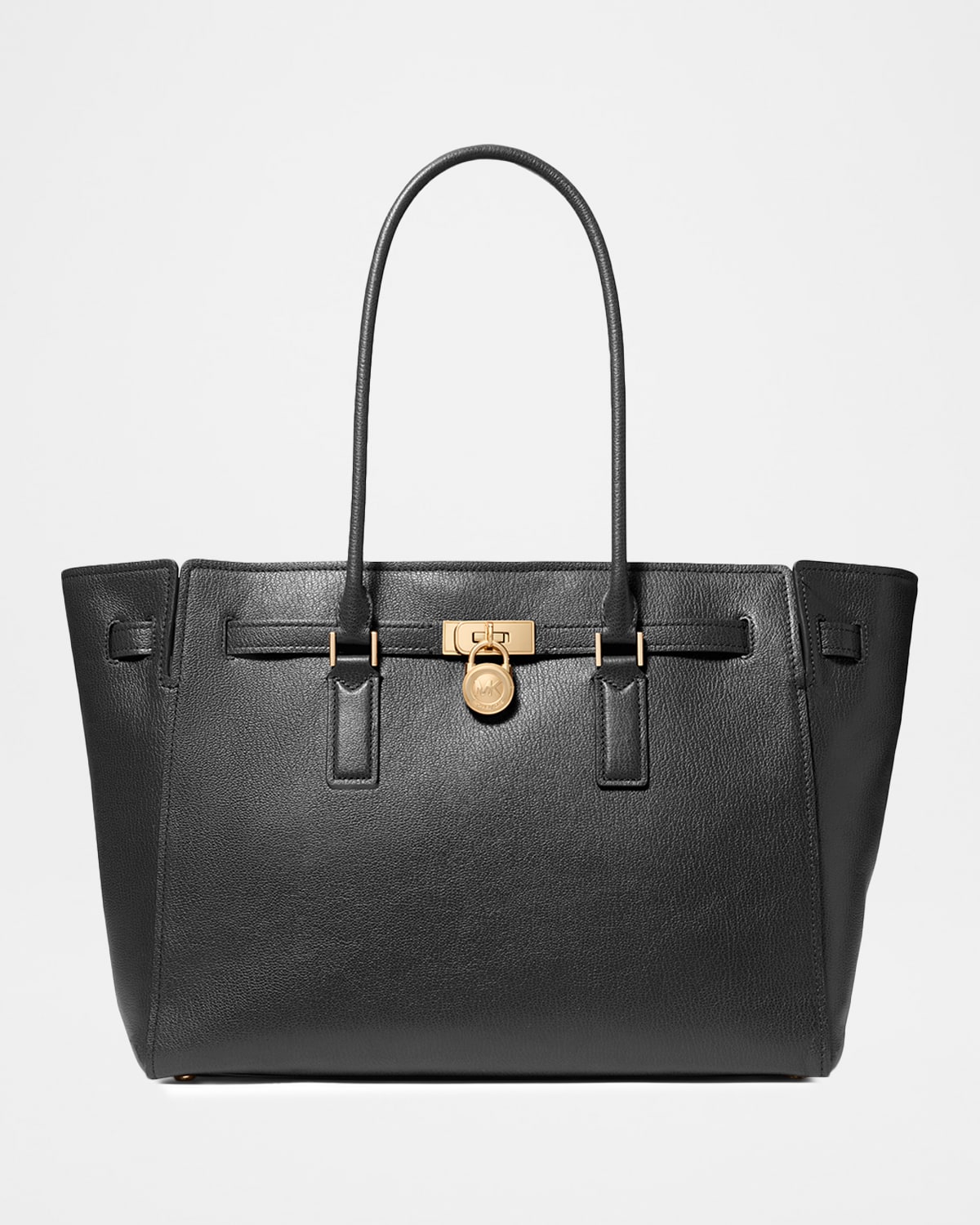 MICHAEL Michael Kors "Hamilton" tote bag in grained leather Rolled shoulder straps Zip top closure Belt strap with padlock and pushlock closure Interior, one zip pocket and two slip pockets Lining: Polyester Feet protect the bottom of the bag Approx. 12"H x 20.5"W x 5.5"D Imported