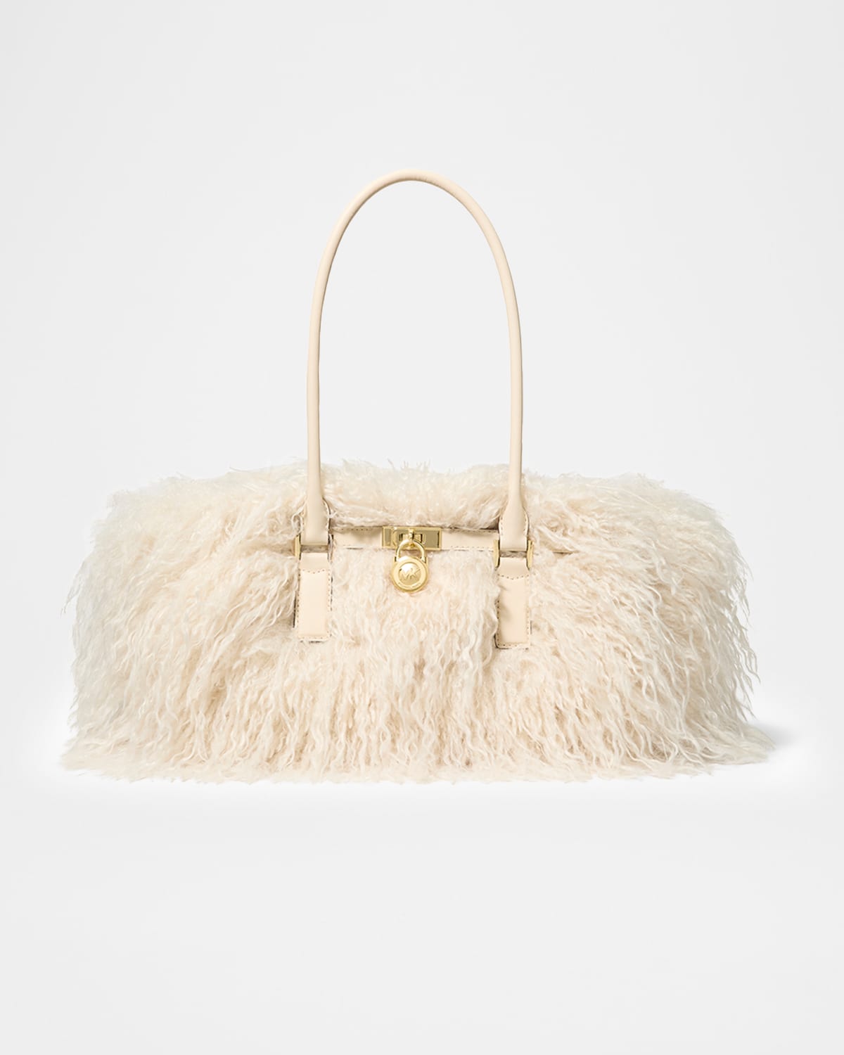 MICHAEL Michael Kors "Hamilton" eastwest tote bag in leather and faux fur (polyester) Rolled shoulder straps Zip top closure Belt strap with padlock and turnlock closure Interior, two slip pockets Lining: Rayon Approx. 11.5"H x 15.8"W x 3.3"D Polyester/cotton Imported