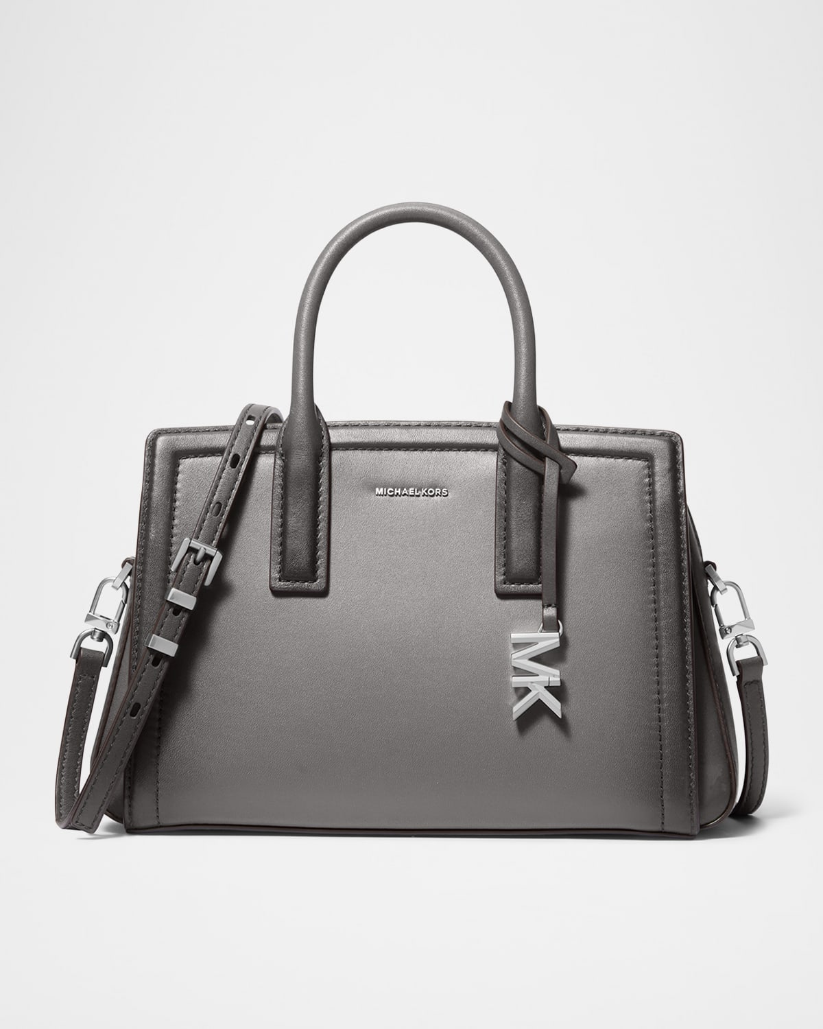 MICHAEL Michael Kors "Laila" small satchel crossbody bag in leather, finished with fading for a sophisticated aged effect Rolled top handles Detachable, adjustable crossbody strap Can be worn as a top handle or shoulder/crossbody bag Removable MK logo tag Open top with magnetic closure Center zip compartment divides interior; one slip pocket and one zip pocket Lining: Polyester Feet protect the bottom of the bag Approx. 7.3"H x 10"W x 4.8"D Imported