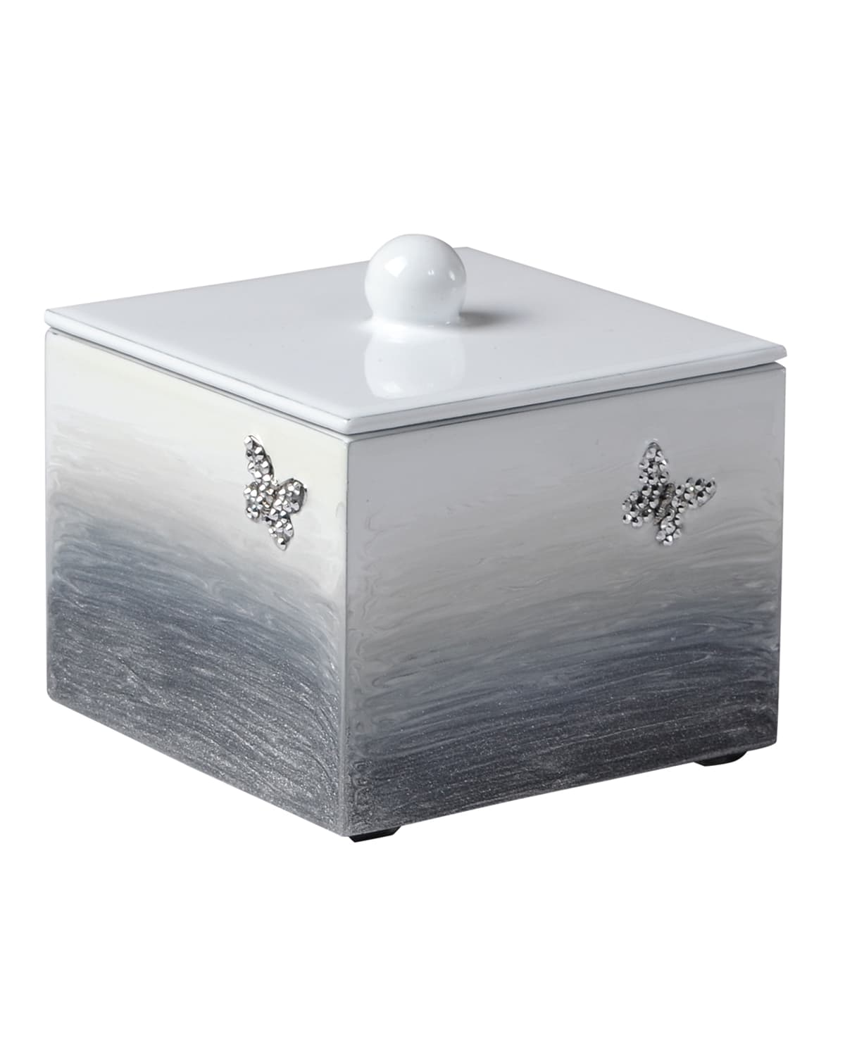 Wood container with hand enameled outer. Silver stoned butterfly detail. 3.75"Sq. x 5"T. Made in the USA.