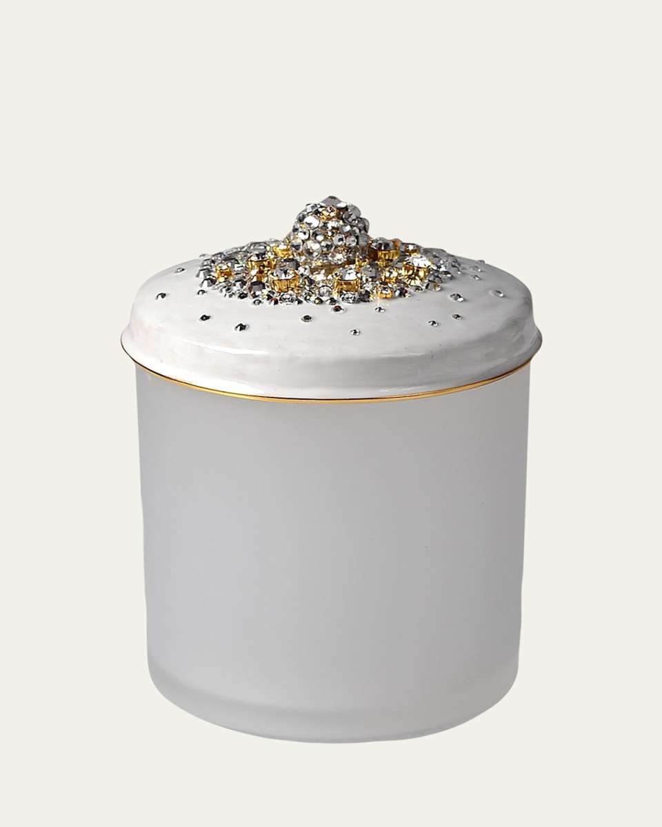 Frosted glass cotton swab container with electroplated metal lid. Lid embellished with a gradient effect of rhinestones and crystals. Epoxy resin. Approx. 3.75"Dia. x 5.5"T. Wipe with a damp cloth. Made in the USA.