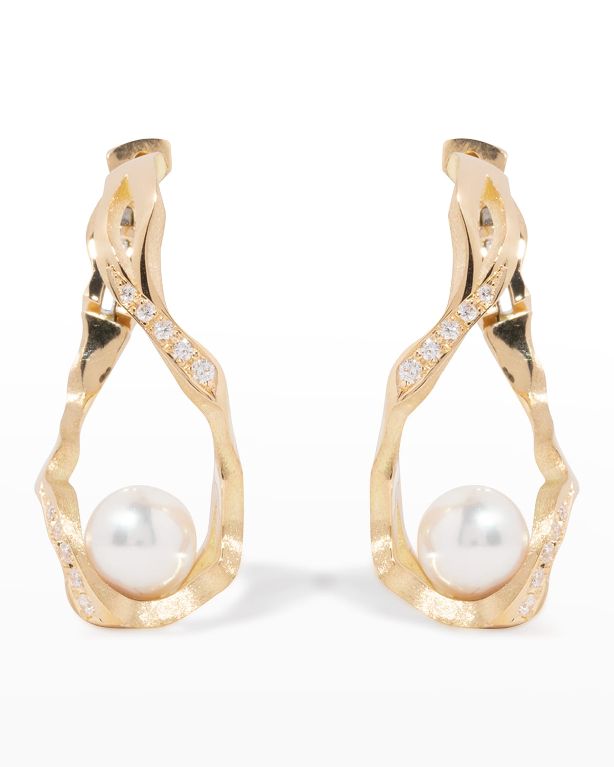 Milamore kintsugi infinity hoop earrings are an iconic piece from the kintsugi collection. inspired by the double helix form of DNA, the Mobius strip that represents infinity, and the lucky number 8 in Japan. Milamore Fine Jewelry earrings 18karat yellow gold Round white diamonds Naturally white Akoya cultured pearls 27.3mm drop length, 17.611.6mm width per earring Total diamond carat weight: 0.09 For pierced ears Made in Japan