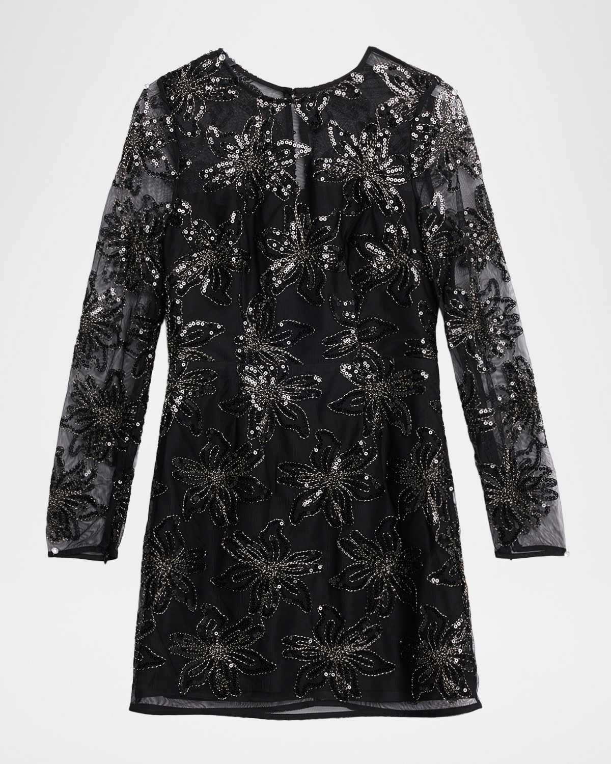 Milly "Adele" mini cocktail dress comprised of a detailed mesh overlay with sequined florals Approx. 33.3"L from shoulders to hem Round neckline Long sleeves Hem falls above the knee Sheath silhouette Concealed zip closure Polyurethane/polyester Lining: Polyester/spandex Dry clean Imported