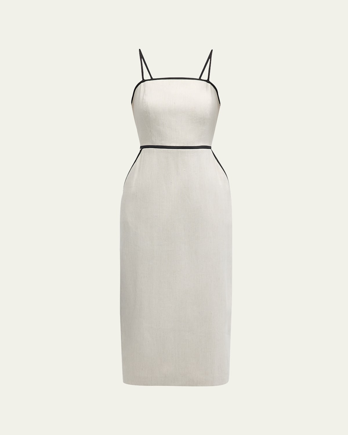 Milly "Amara" midi dress with contrast trim Square neckline Sleeveless Adjustable straps Side slant pockets Center back vent Hem falls below the knee Aline silhouette Invisible back zipper Linen/rayon/cellulose acetate/spandex Lining: Cotton Dry clean Imported