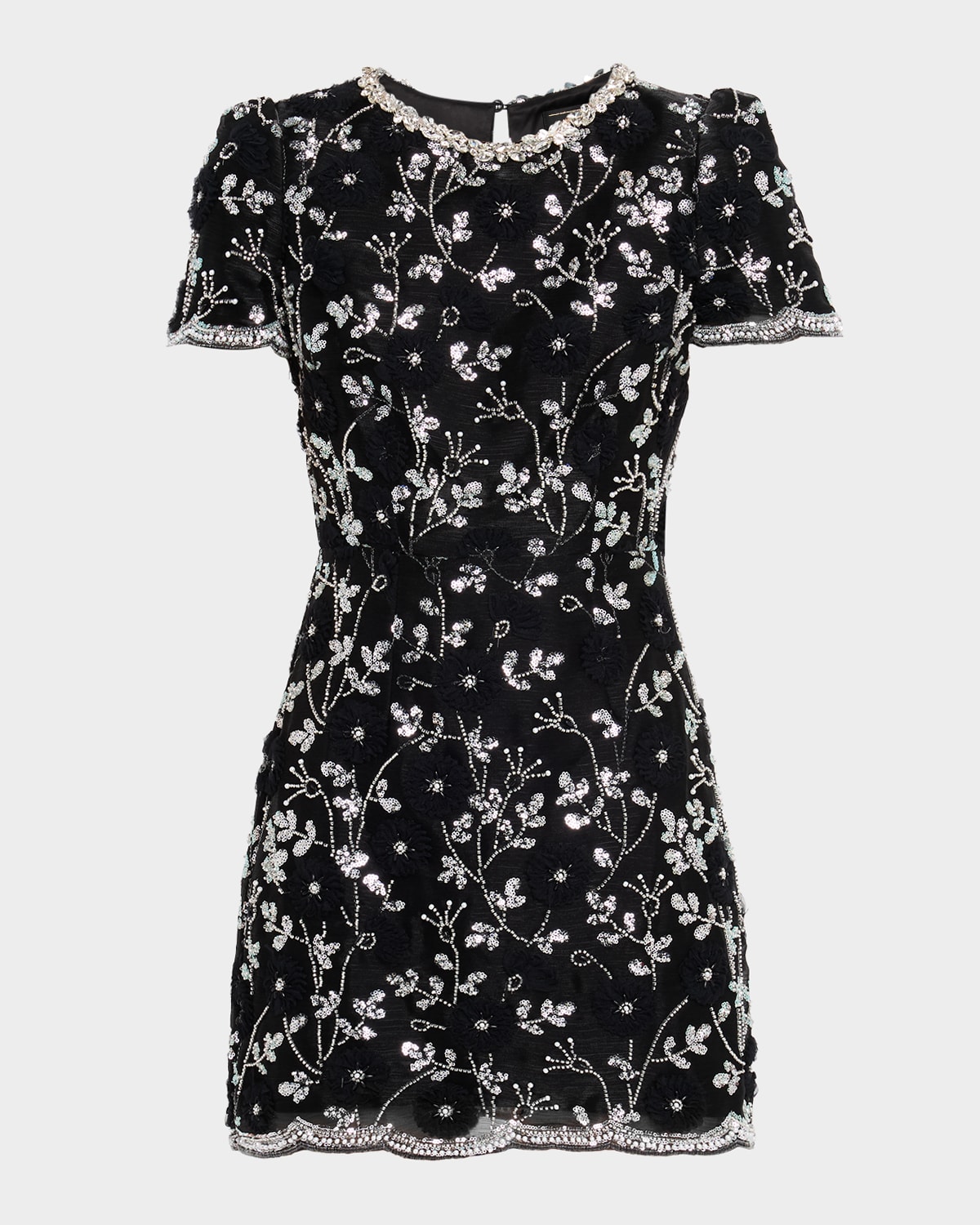 Milly "Daisy" eyecatching cocktail dress decorated with silvertone floral embroidery, flower appliqués, and crystal accents Approx. 34.8"L from shoulders to hem Round neckline Short sleeves Scalloped hem Mini length Sheath silhouette Back/keyhole back closure Polyester/nylon/polyamide Lining: Polyester/spandex Dry clean Imported