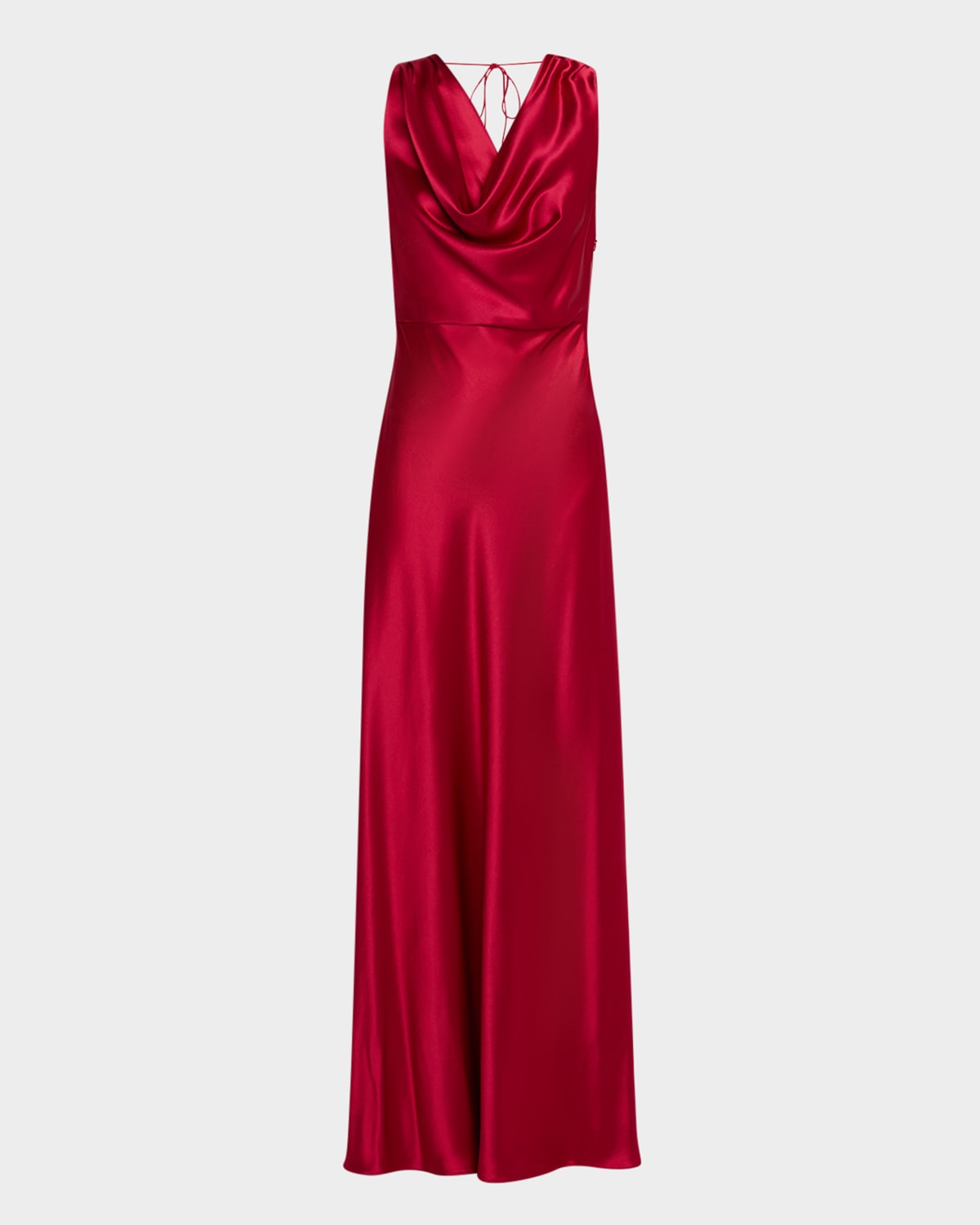 Milly "Elsa" gown crafted of fluidlike satin and draped with a selftie cowl back Approx. 60.5"L from shoulders to hem Cowl neckline Sleeveless Seamed waist Floor length Slip silhouette Side zip closure Acetate/polyester Unlined Dry clean Imported