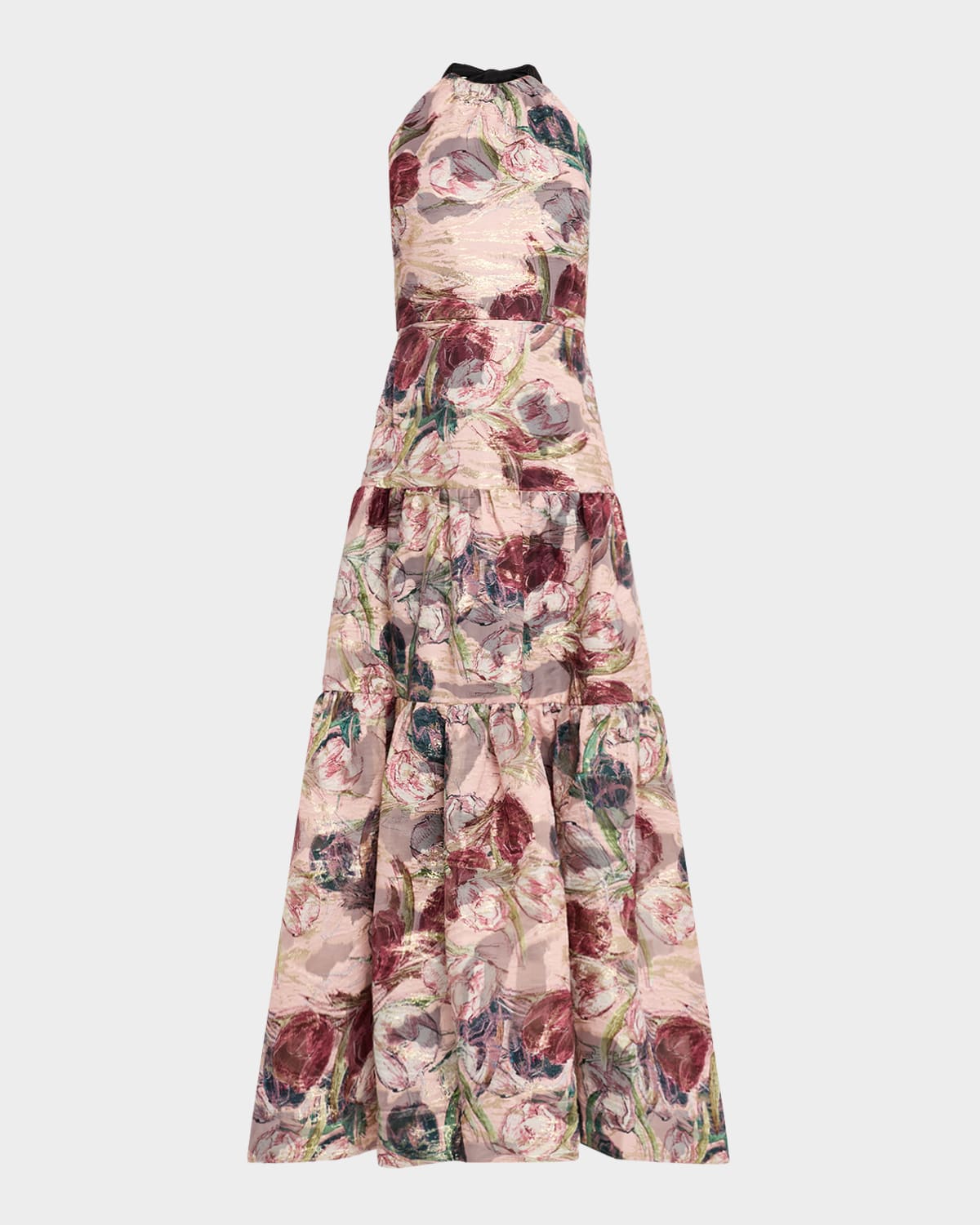 This tiered Milly "Gizelle" gown is cut from metallic floral brocade, subtly contrasted with an adjustable selftie behind the neck Approx. 60"L from shoulders to hem Halter neckline Sleeveless Lowcut back Full length Aline silhouette Invisible back zipper Polyester/polyester Lining: Polyester/spandex Dry clean Imported
