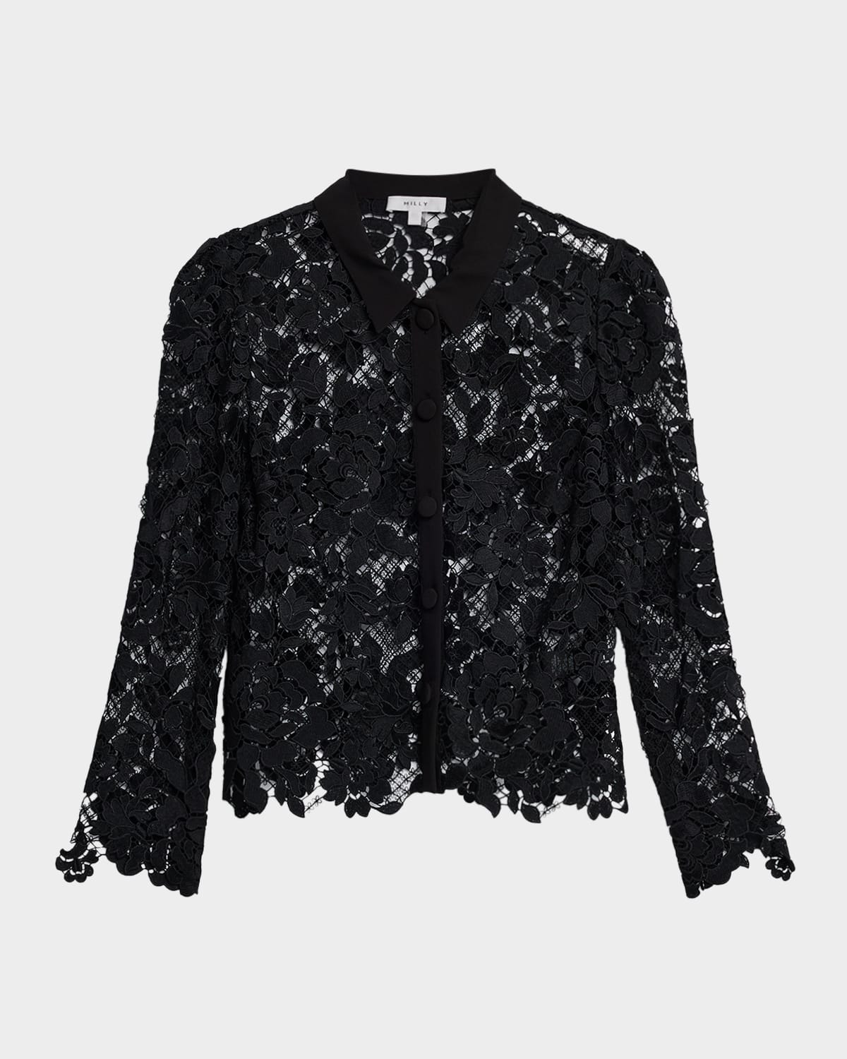This Milly "June" blouse is crafted in Rose Mosaic lace with feminine scalloped cuffs and hem Approx. 21.5"L from shoulders to hem Point collar Button front closure Bracelet sleeves Zip cuffs Boxy fit Polyester Unlined Dry clean Imported