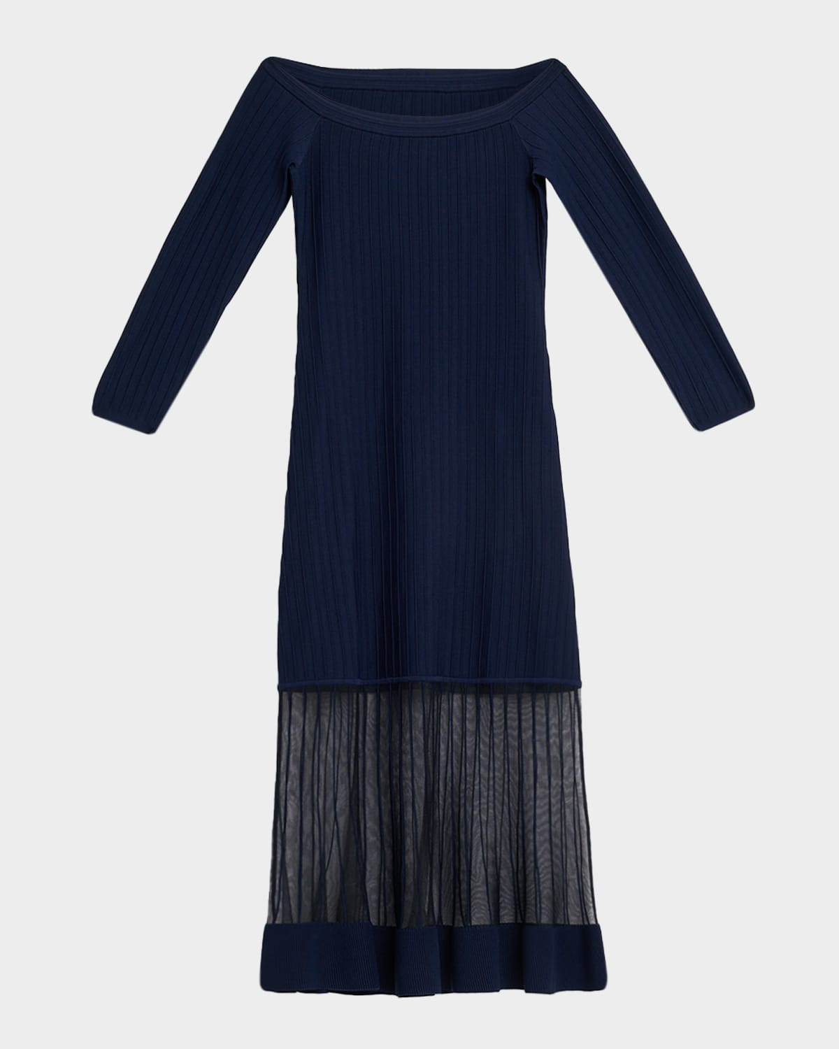 This Milly midi dress combines a cozy and stretchy rib knit with sheer organza, adding a sultry touch to the comfortable design Approx. 42"L from shoulders to hem Offtheshoulder neckline 3/4 sleeves Hem falls below the knee Aline silhouette Slipover style Viscose/nylon/polyamide/polyester Unlined Dry clean Imported