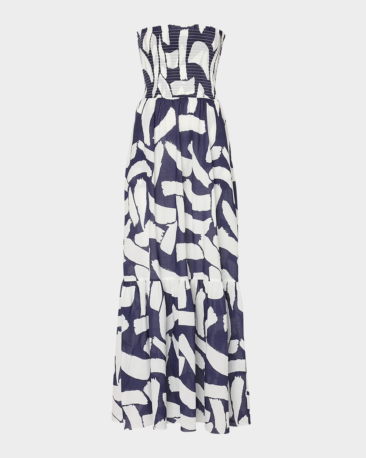 Milly "Olen" cotton voile dress features a shirred bodice and a full, tiered skirt Strapless neckline Sleeveless Side seam pockets Full length Aline silhouette Slipover style Cotton Unlined Hand wash Imported