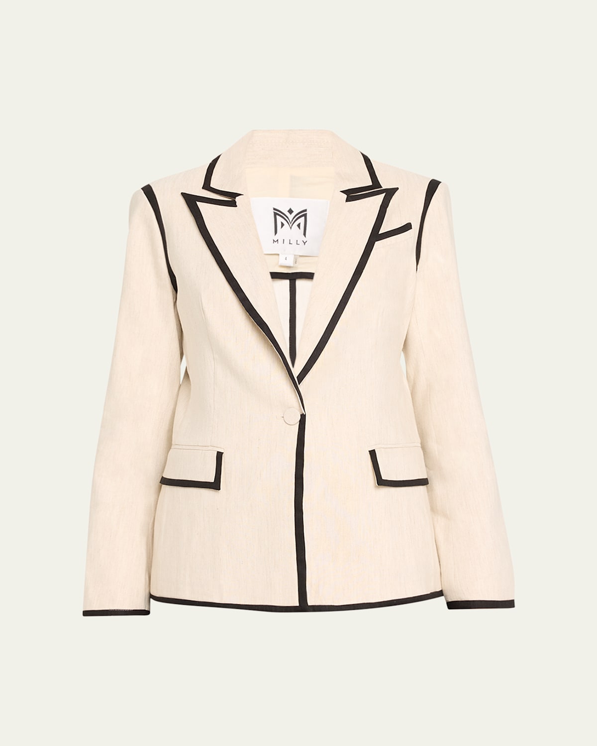 Milly jacket with contrast trim Peak lapel; singlebutton front Long sleeves; button cuffs Chest welt pocket Front flap pockets Center back vent Relaxed fit Linen/rayon/cellulose acetate/spandex Lining: Cotton Dry clean Imported