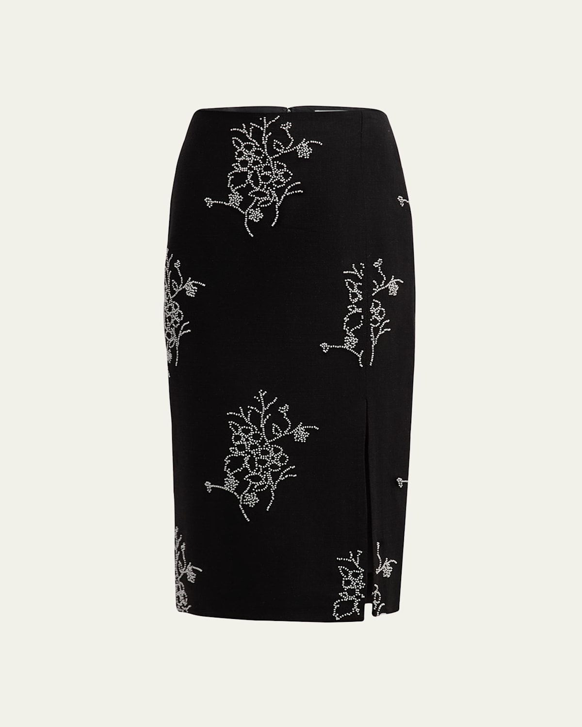 Milly "Santanna" midi skirt with contrast bead embroidery Sits high on the hips Sideslit hem Hem falls below the knee Skirt falls straight from hip to hem Invisible back zipper Viscose/linen Lining: Polyester Imported