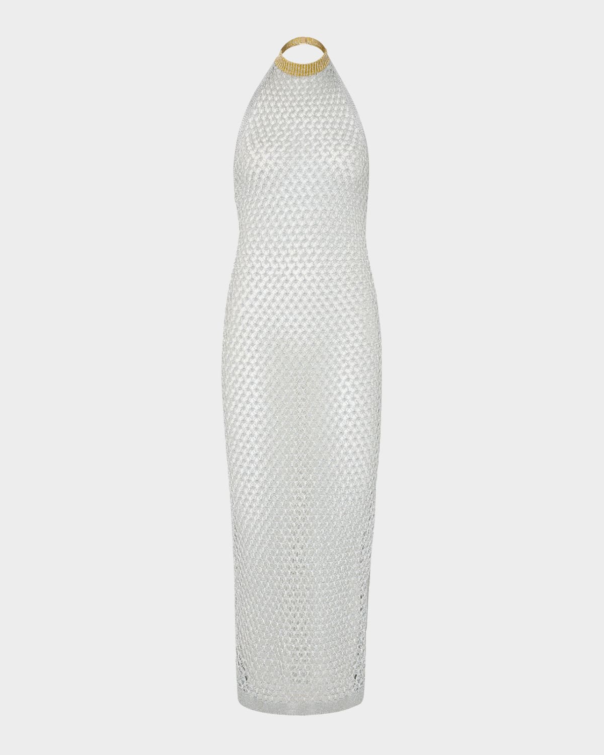 Milly "Simone" twotone metallic knit dress Halter neckline; clasps behind the neck Sleeveless Open back Thighhigh side slit Hem falls below the knee Bodyskimming silhouette Slipover style Polyester/Promodal® rayon Unlined Imported