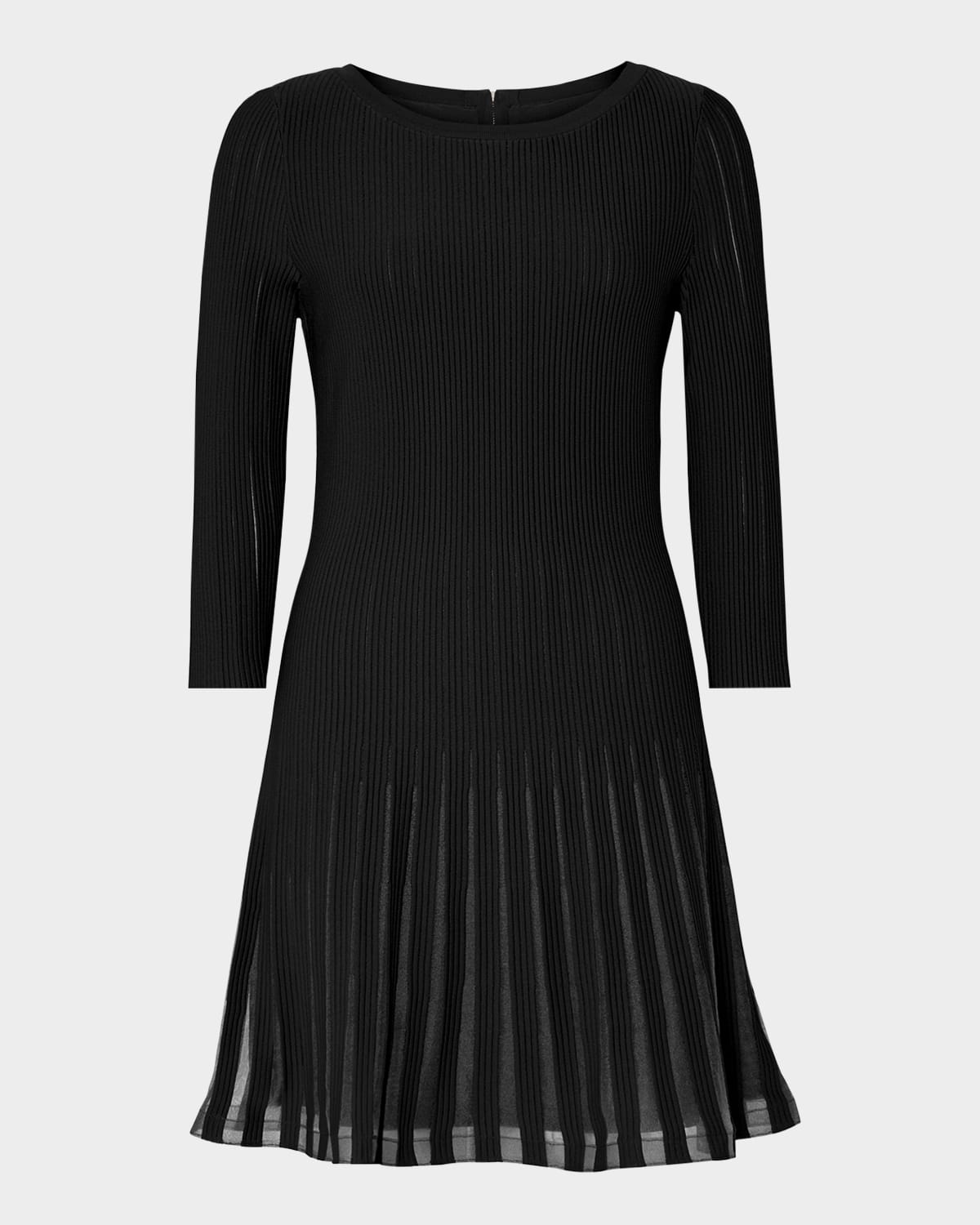 Milly "Tabitha" ribbed mini dress with sheer godet inserts High neckline; partial zip front 3/4 sleeves Hem falls above the knee Aline silhouette Slipover style Viscose/nylon/polyamide/polyester Lining: Polyester/spandex Hand wash Imported