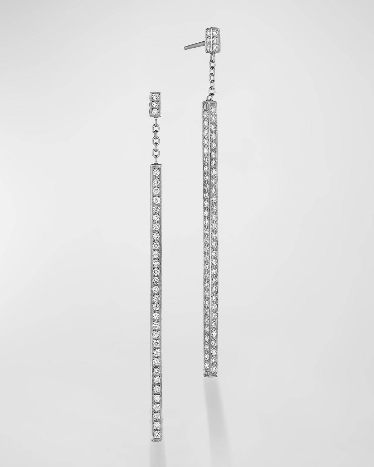Mimi So stick dangle earrings. Polished 18karat white gold. Diamonds at posts and drops. 1.32 total diamond carat weight. Post backs for pierced ears. Approx. 1.8"L.