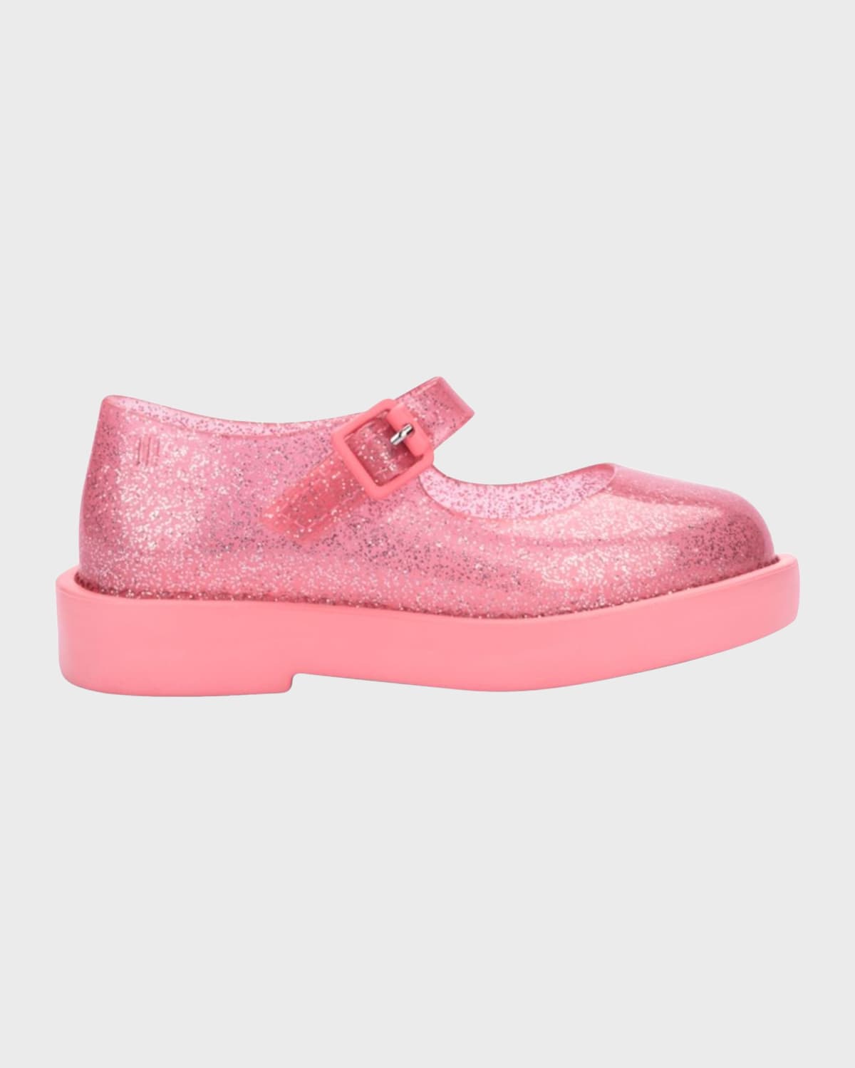 Mini Melissa Mary Jane shoes in glitter PVC Recyclable, vegan, ecofriendly production Flat heel Round toe Buckle strap midvamp Contrast sole Made in Brazil