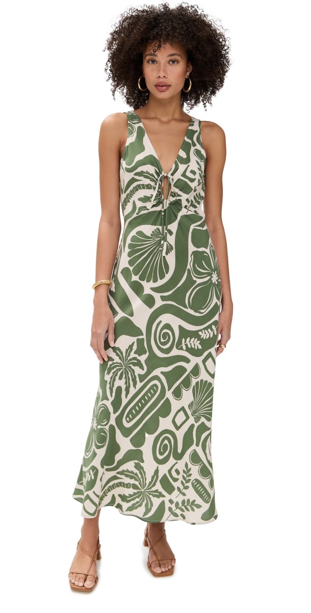 Fabric: Lightweight stretch weave. Tie keyhole at bust. Tropical print. V neck. Hook-and-eye and hidden zip at side. Shell: 100% viscose. Unlined. Hand wash. Imported, China. Measurements: Measurements from size S Length: 51.25in / 130.0cm, from shoulder