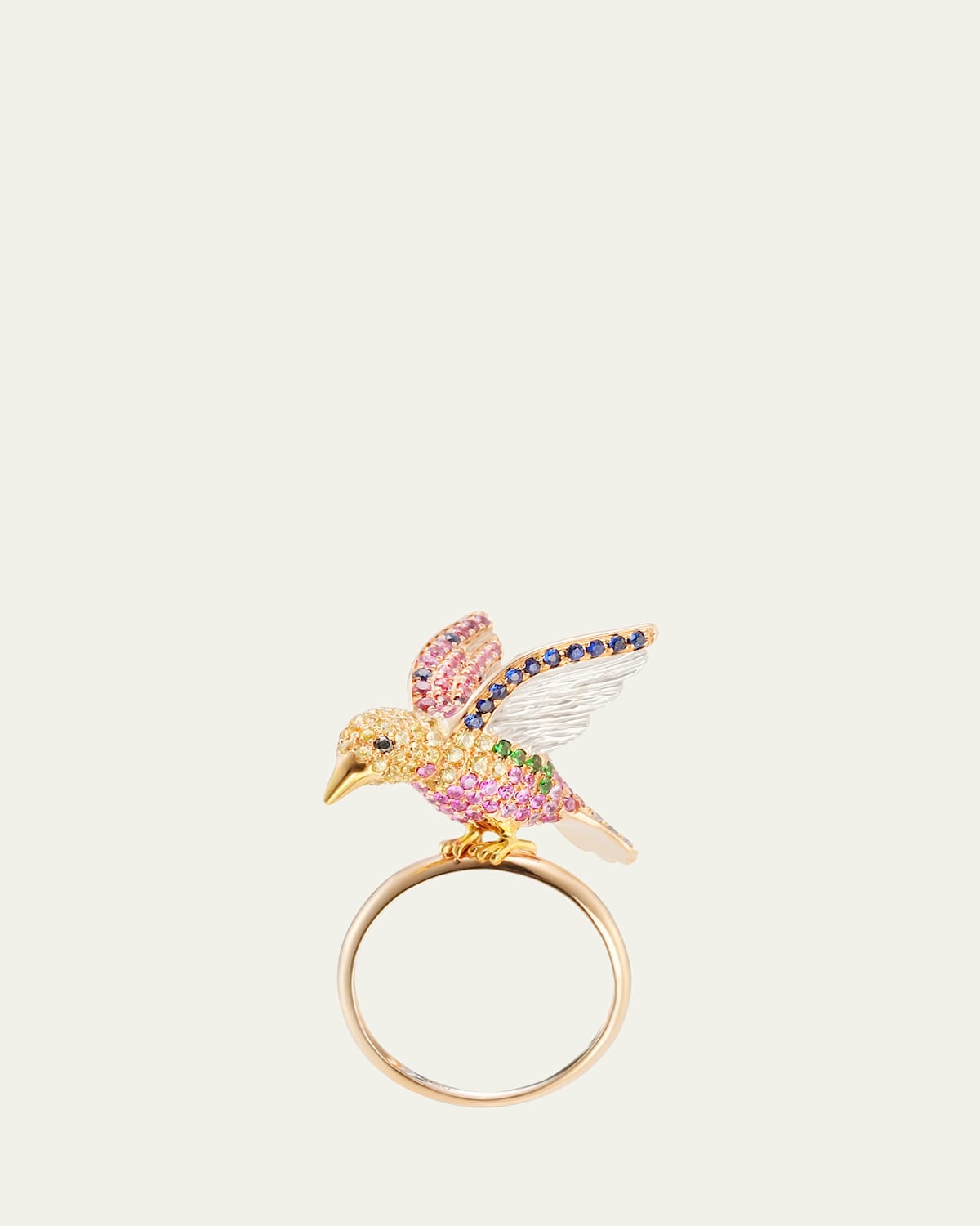 Mio Harutaka ring Approx. ring size 6 18karat yellow gold Pink, yellow and blue sapphires Black diamond and green garnet Diamond total carat weight: 0.02 Garnet total carat weight: 0.10 Blue sapphire carat weight: 0.39 Yellow sapphire carat weight: 0.60 Pink sapphire carat weight: 1.28 Made in Japan
