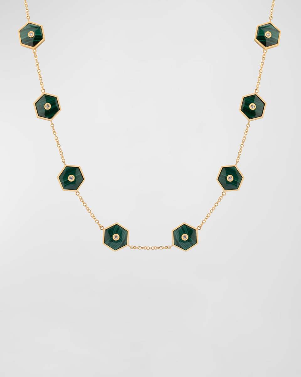 Miseno necklace from the Baia collection Approx. 32" length Polished 18karat yellow gold Hexagonalshaped malachite Diamond bezel at each station 1.29 total diamond carat weight Lobster clasp Made in Italy