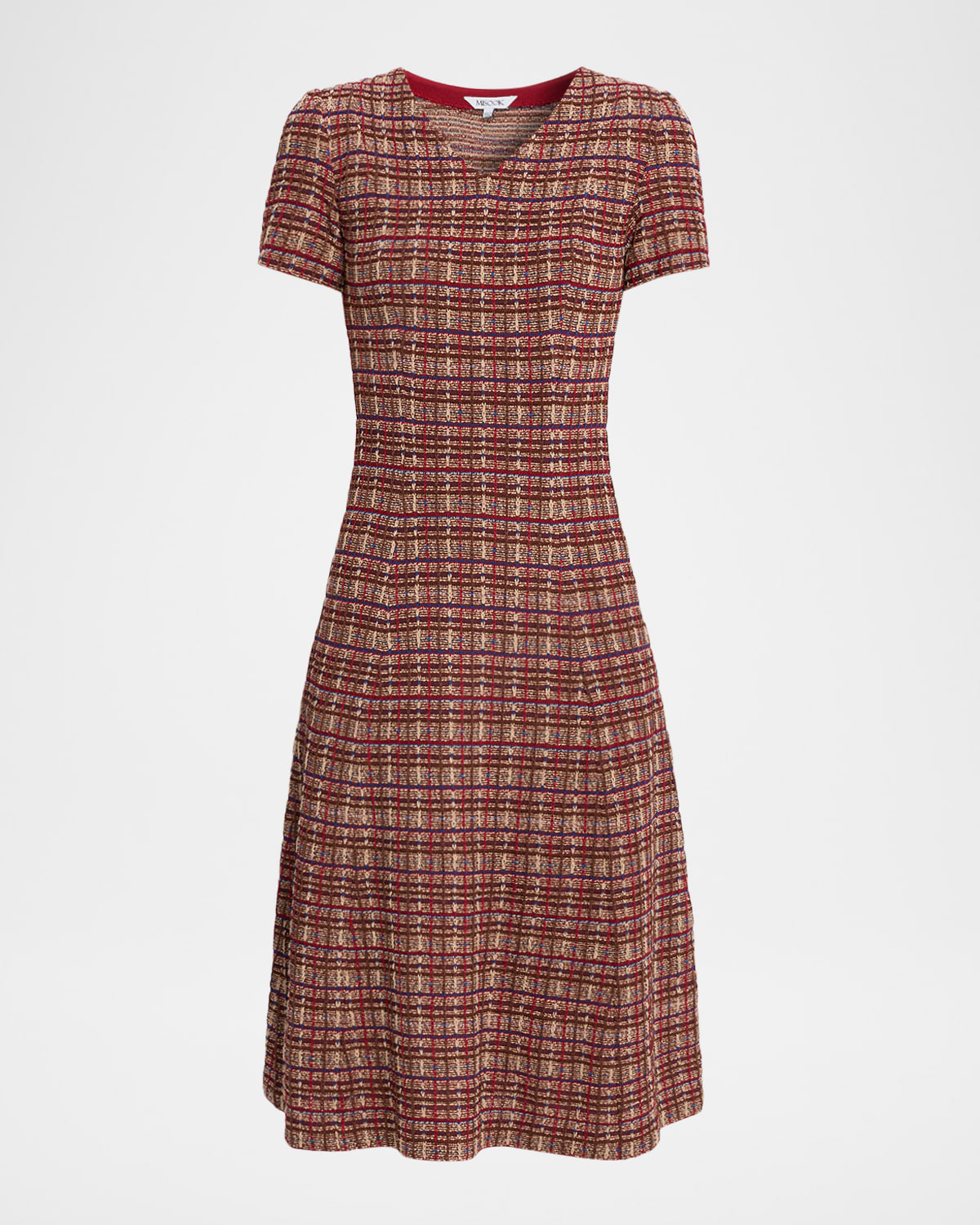 A contemporary rendition of classic plaid, this Misook dress features an intricate multistitch knit for depth and refined style. Approx. 45"L from shoulder to hem V neckline Short sleeves Hem falls below the knee Aline silhouette Slipon closure Acrylic/polyester/cotton Unlined Machine wash Imported