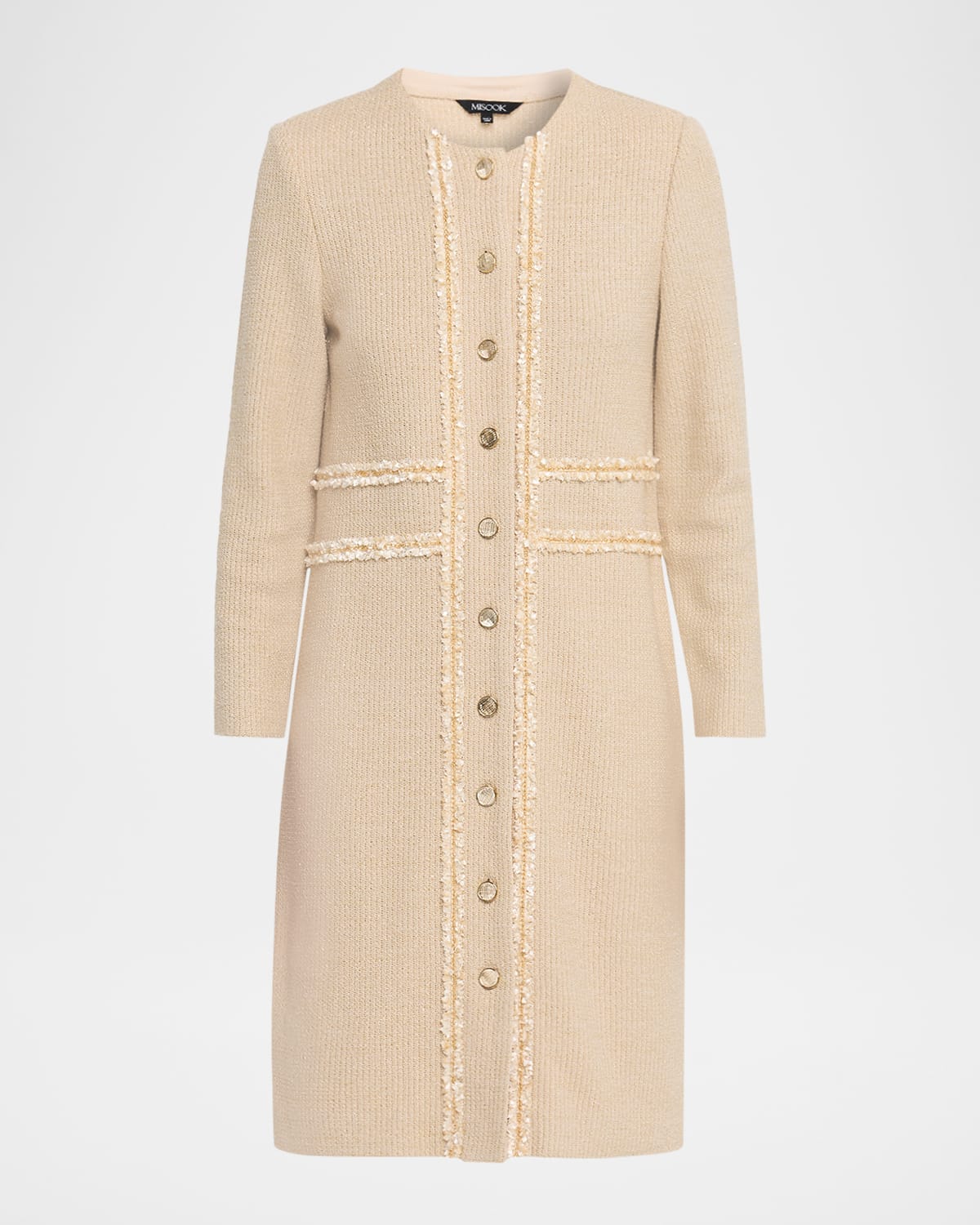 A statement of artistry of elegance, this Misook knit jacket gleams with metallic threads and ribbon chain trim Approx. 39" from shoulder to hem Jewel neckline Long sleeves Soft shoulder pads Heritage fit: long, straight cut Button front closure Rayon/cellulose acetate/polyester/nylon Unlined Hand wash Imported