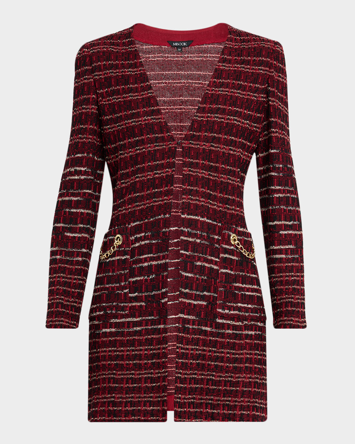 Misook tailored multistitch knit jacket adorned with goldtone grommet and chain trim accents Approx. 32"L from shoulder to hem Open front Long sleeves Soft shoulder pads Two front patch pockets Deep side slits Heritage fit Hookandeye closure Acrylic/nylon/rayon Unlined Hand wash in cold water Imported