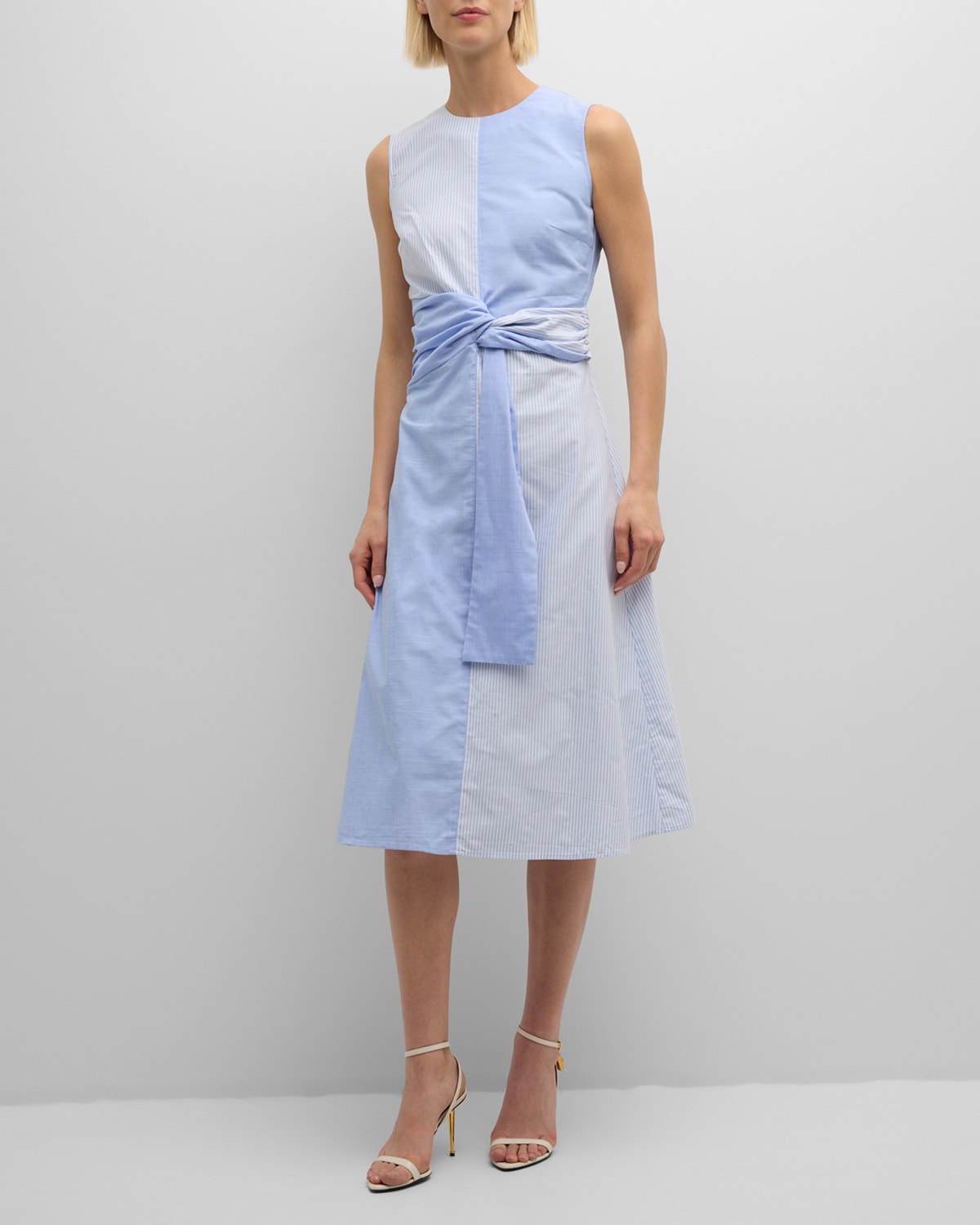 Misook midi dress features a split pattern of solids and stripes Approx. 45"L from shoulders to hem Jewel neckline Sleeveless Waist selftie Hem falls below the knee Aline silhouette Invisible back zipper Cotton/linen Unlined Hand wash Imported