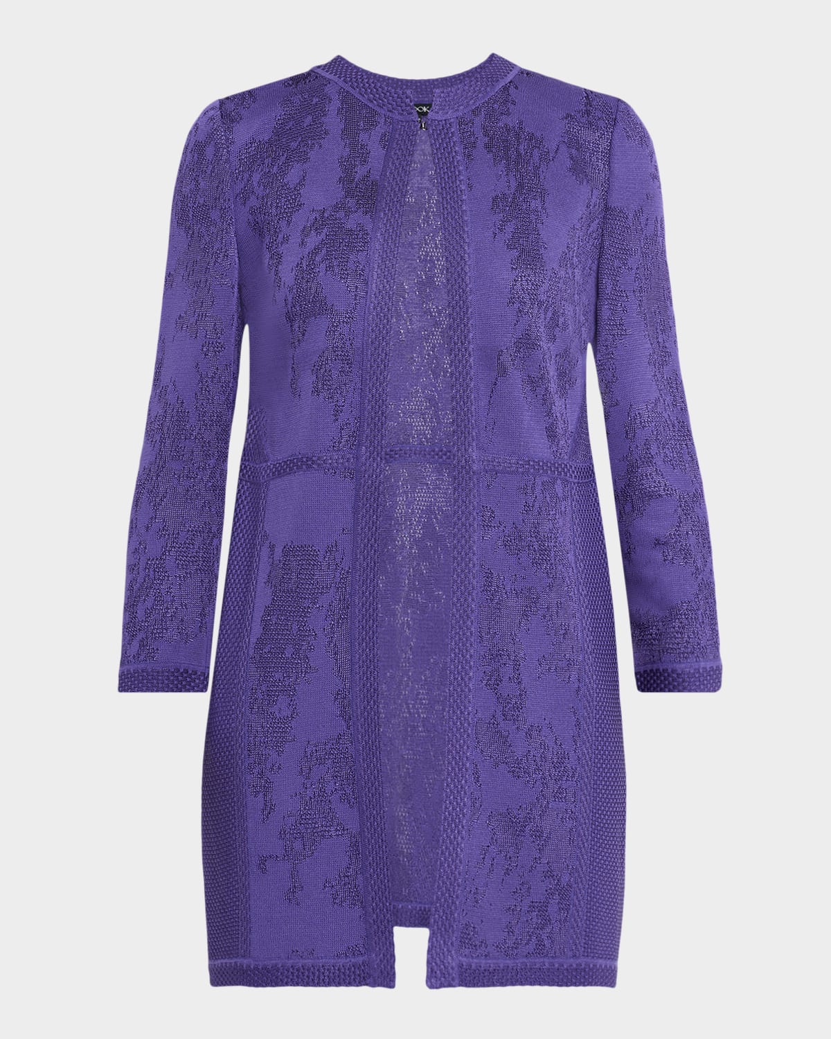 This Misook jacket blends sophistication and comfort, knit in a tonal jacquard design for subtle texture Approx. 32"L from shoulders to hem Mandarin collar Single hookandeye front closure Padded shoulders Bracelet sleeves; approx. 20L Heritage silhouette Viscose/acrylic/nylon/polyamide Unlined Machine wash cold Imported