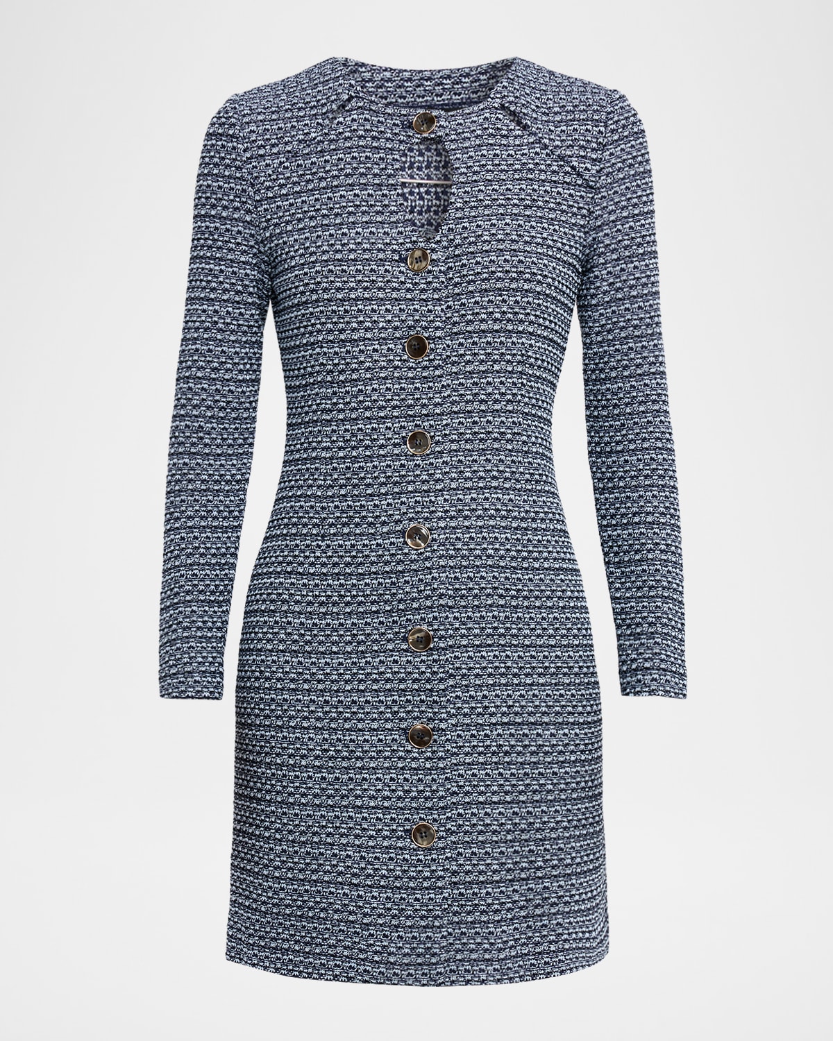 This Misook x Lani Lynn midi dress is crafted in textured tweed, meticulously detailed with keyhole cutouts and vertical seams for a tailored fit Designed in collaboration with model and content creator Lani Lynn Approx. 35"L from shoulders to hem Jewel neckline Button front closure Long sleeves; approx. 23"L Hem falls above the knee Aline silhouette Acrylic/nylon/polyamide/rayon/cellulose acetate Unlined Machine wash cold Imported