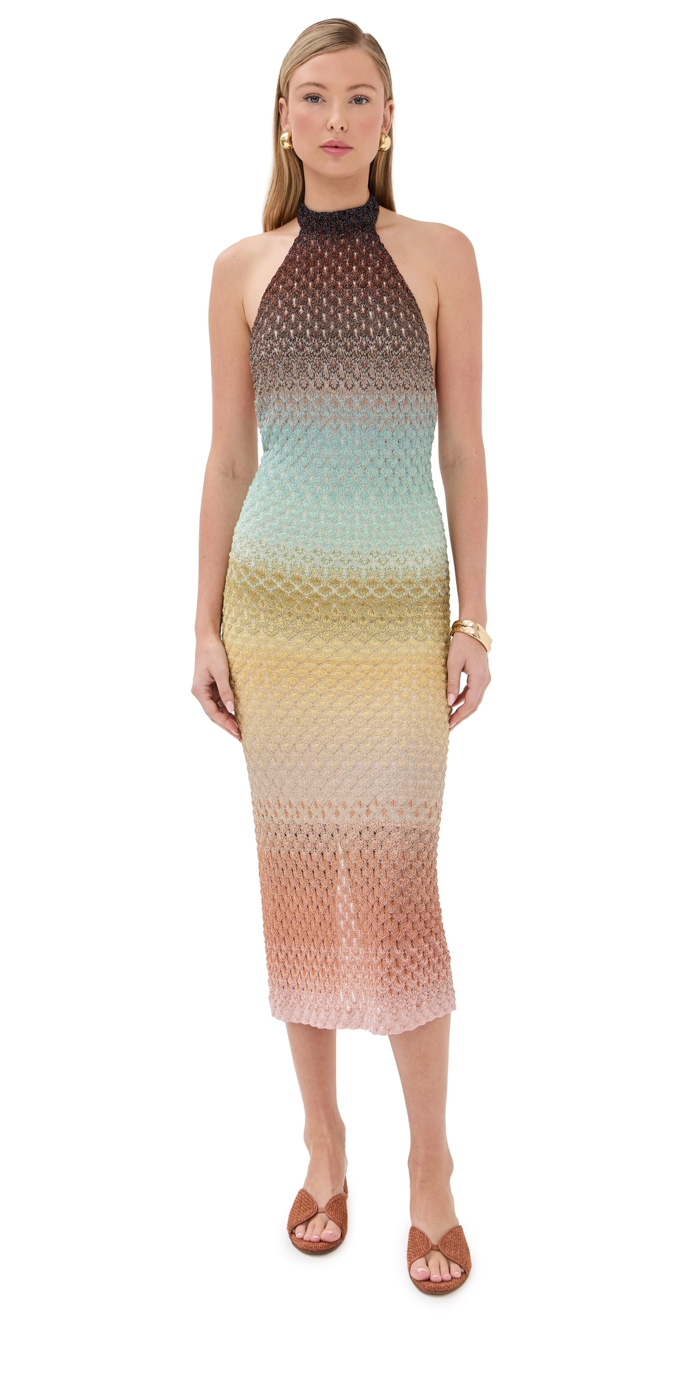 Fabric: Lightweight stretch knit. Ombre design with metallic threading. Midi length. Halter neckline. Hook-and-eye and hidden zip at back. Shell: 82% viscose/18% metallic. Lined. Lining: 82% viscose/18% spandex. Dry clean. Made in Italy. Measurements: Measurements from size 38 Length: 49.5in / 126.0cm, from shoulder