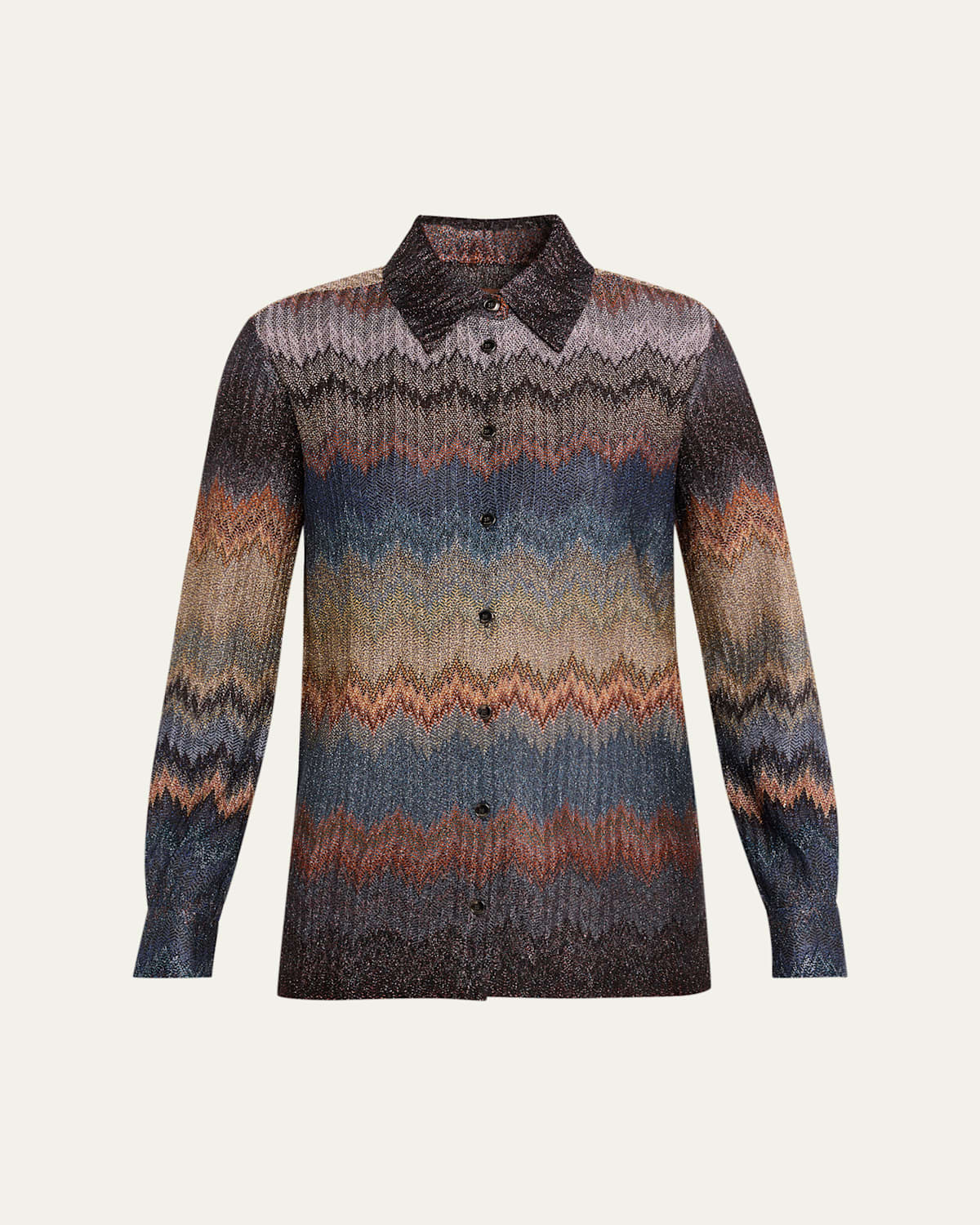 Missoni shirt is crafted of a metallic chevron jacquard Point collar; button front Long sleeves; button cuffs Relaxed fit Straight hem Rayon/cellulose acetate/Lurex® metallic fibers Made in Italy