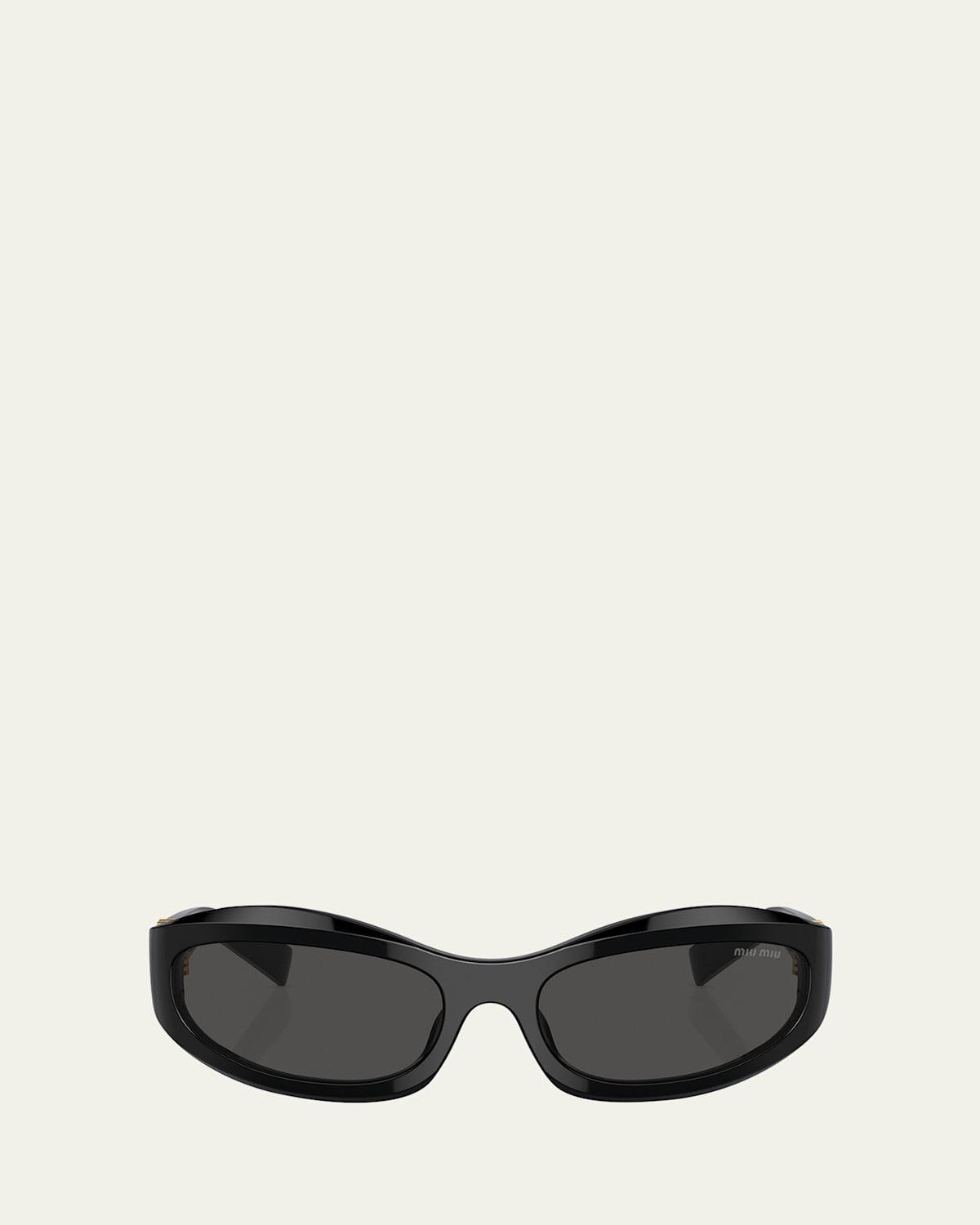 Miu Miu "14ZSF" oval sunglasses in acetate Featuring a contemporary wraparound shape Solidcolor lenses Logo on temples Thin, tapered arms Spot clean Each pair of sunglasses comes with a cleaning cloth and case to clean and protect your sunglasses from scratches and damage. 100% UVA/UVB protection Made in Italy