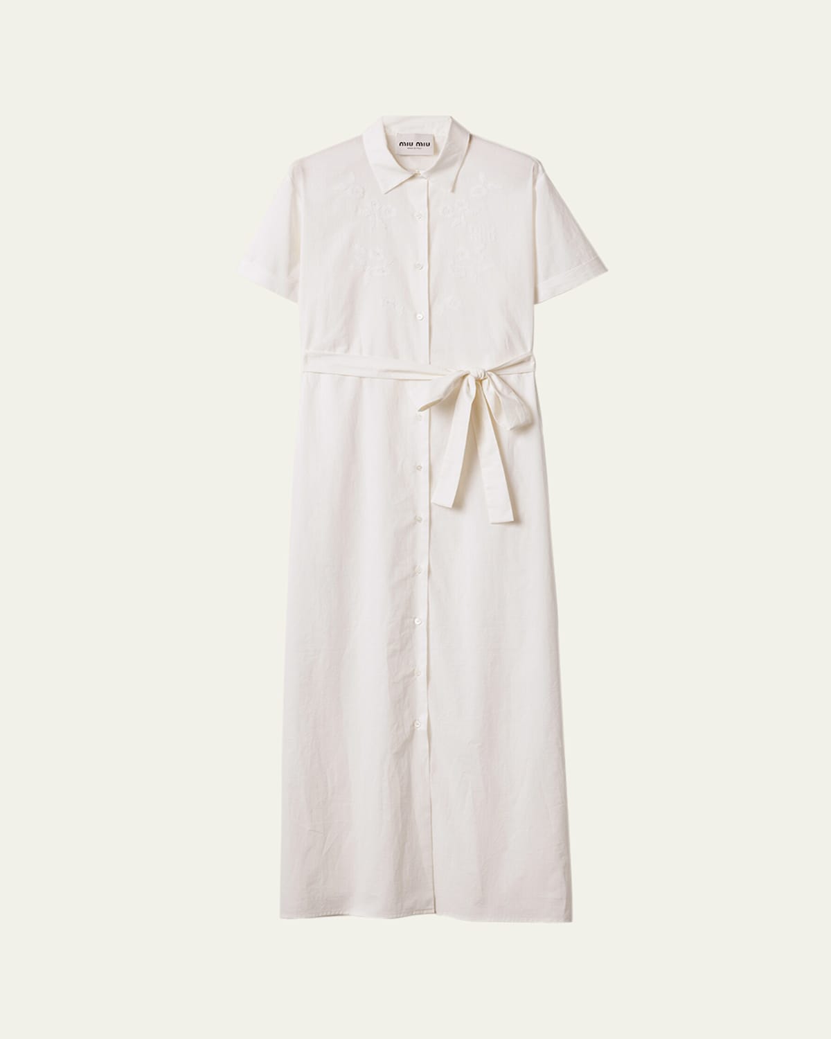 Miu Miu shirtdress is crafted of lightweight cotton embellished with batista flower embroidery and a logo embroidered chest Point collar; button front Short sleeves Selftie belted waist Shift silhouette Full length Side slits Cotton Made in Italy