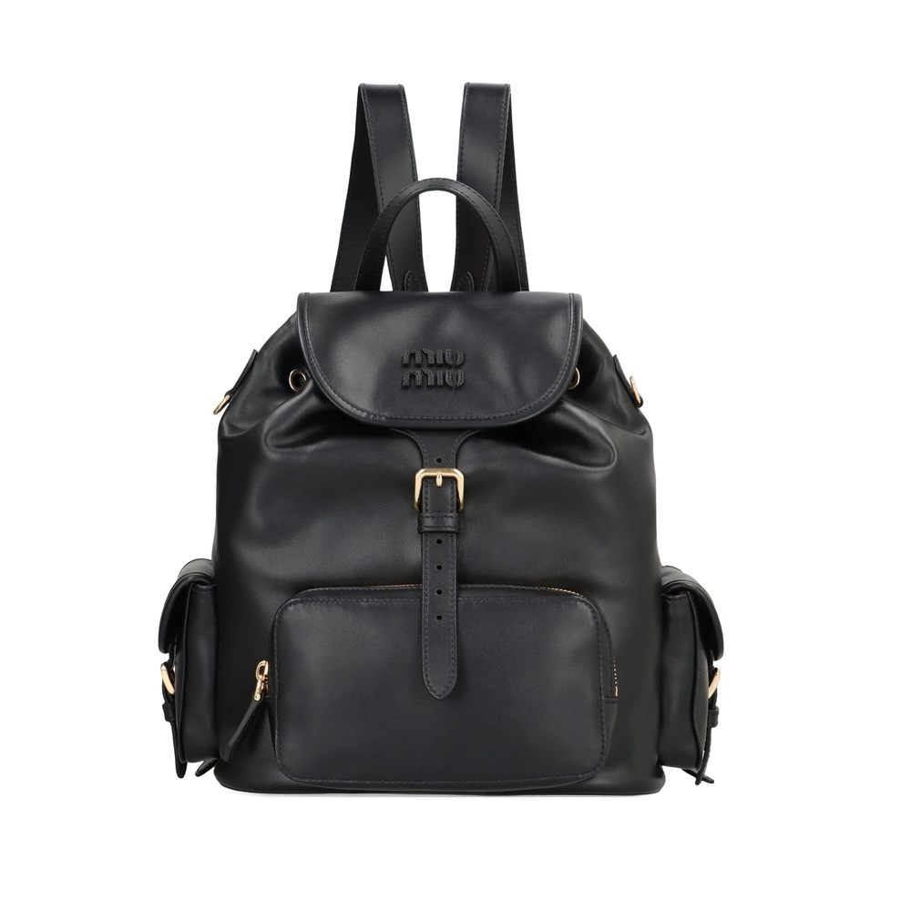 black gold-tone hardware buckle fastening zippered front pocket two side pockets drawstring closure