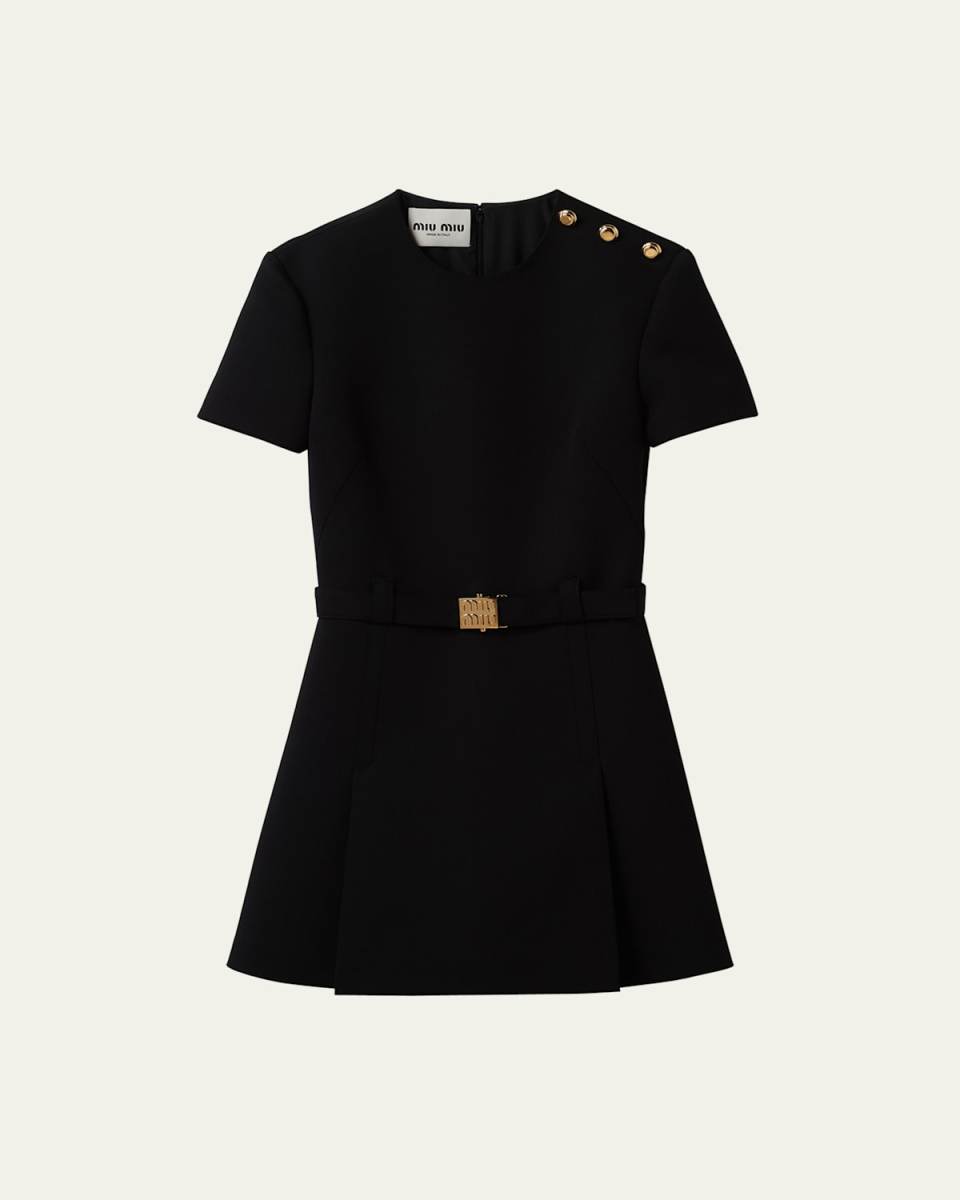 Miu Miu grain de poudre dress featuring a logo belted waist, goldtone button shoulder detail, and a pleated skirt Round neckline Short sleeves Aline silhouette Mini length Invisible back zip Virgin wool/elastane Hand wash or dry clean Made in Italy