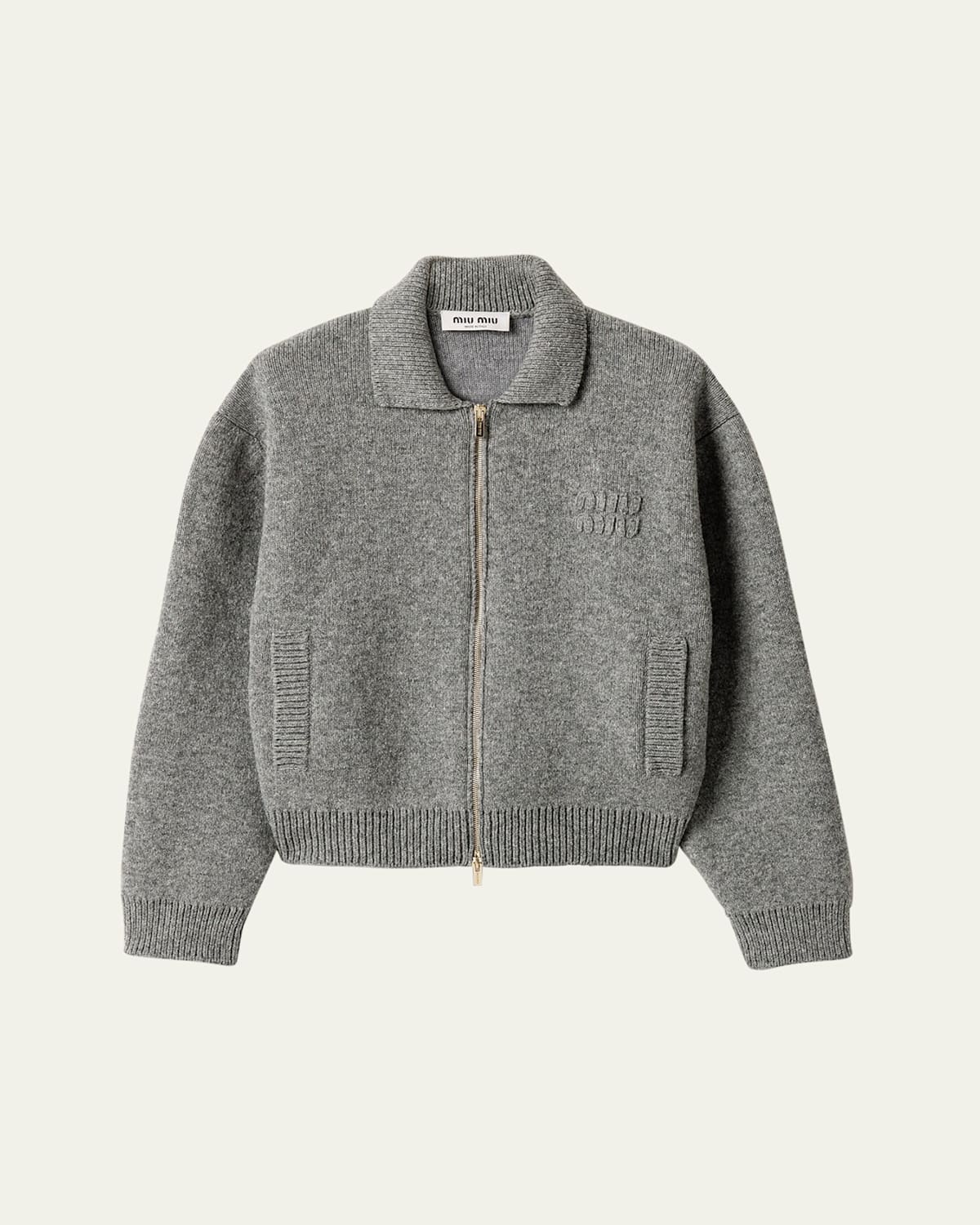 Miu Miu cardigan knit in a woolcashmere featuring a spread collar and a logo embroidered chest Spread collar; twoway zip front Long sleeves Hip welt pockets Relaxed fit Ribbed cuffs and hem Virgin wool/cashmere Made in Italy