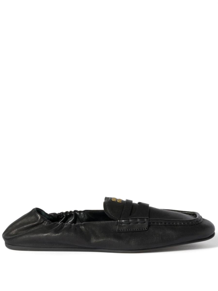 black lambskin embossed logo to the front elasticated band to the back piped-trim detailing penny slot square toe branded leather insole rubber sole