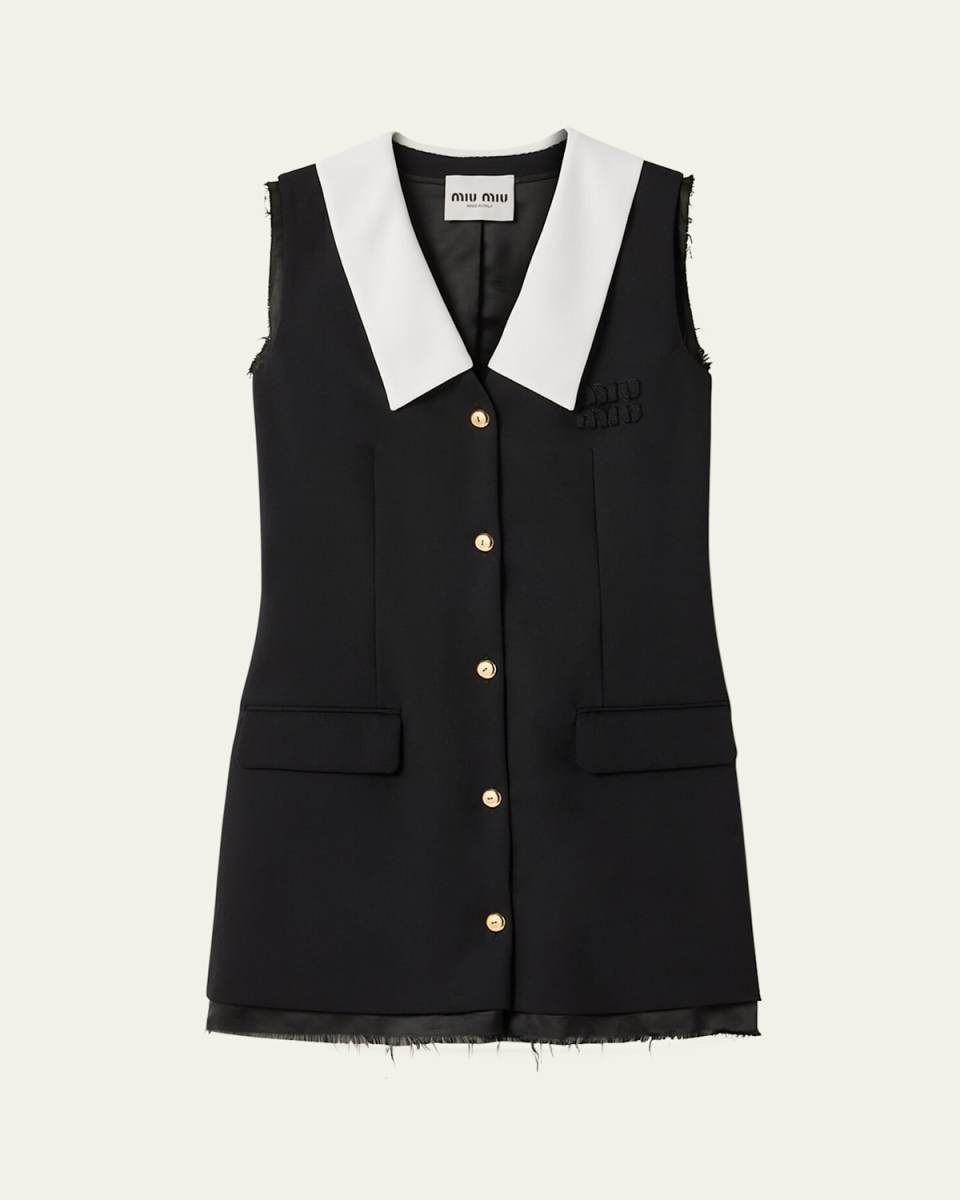 Miu Miu Grain de poudre dress with a sable collar and embroidered logo on the chest Collared V neckline; button front Sleeveless Mini length Shift silhouette Flap pockets Hem with rawcut lining Wool/elastane Made in Italy