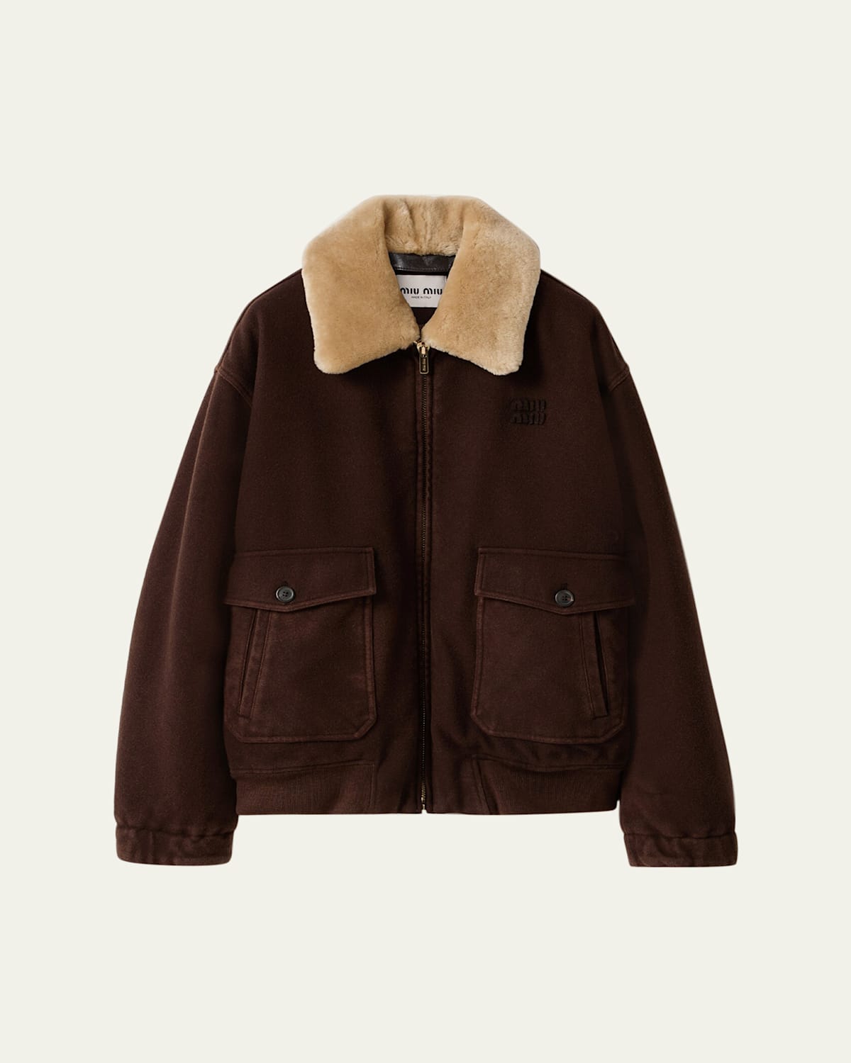 Miu Miu barn jacket with a natural and dyed lamb shearling collar and leather rim Point collar; zipper front Long sleeves; elasticized cuffs Logo embroidered chest Hip buttonflap and welt pockets Oversized fit Ribbanded hem Wool/nylon/polyamide/shearling Made in Italy