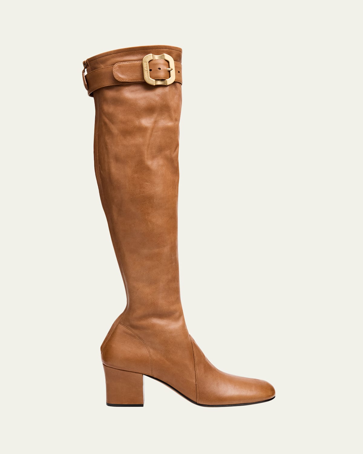 Complete with an oversized logoengraved buckle around the collar, the "Stivali" overtheknee boots by Miu Miu are made from stretch leather 2.50 in / 65 mm block heel Round toe Back zip closure Unlined Leather outsole Made in Italy