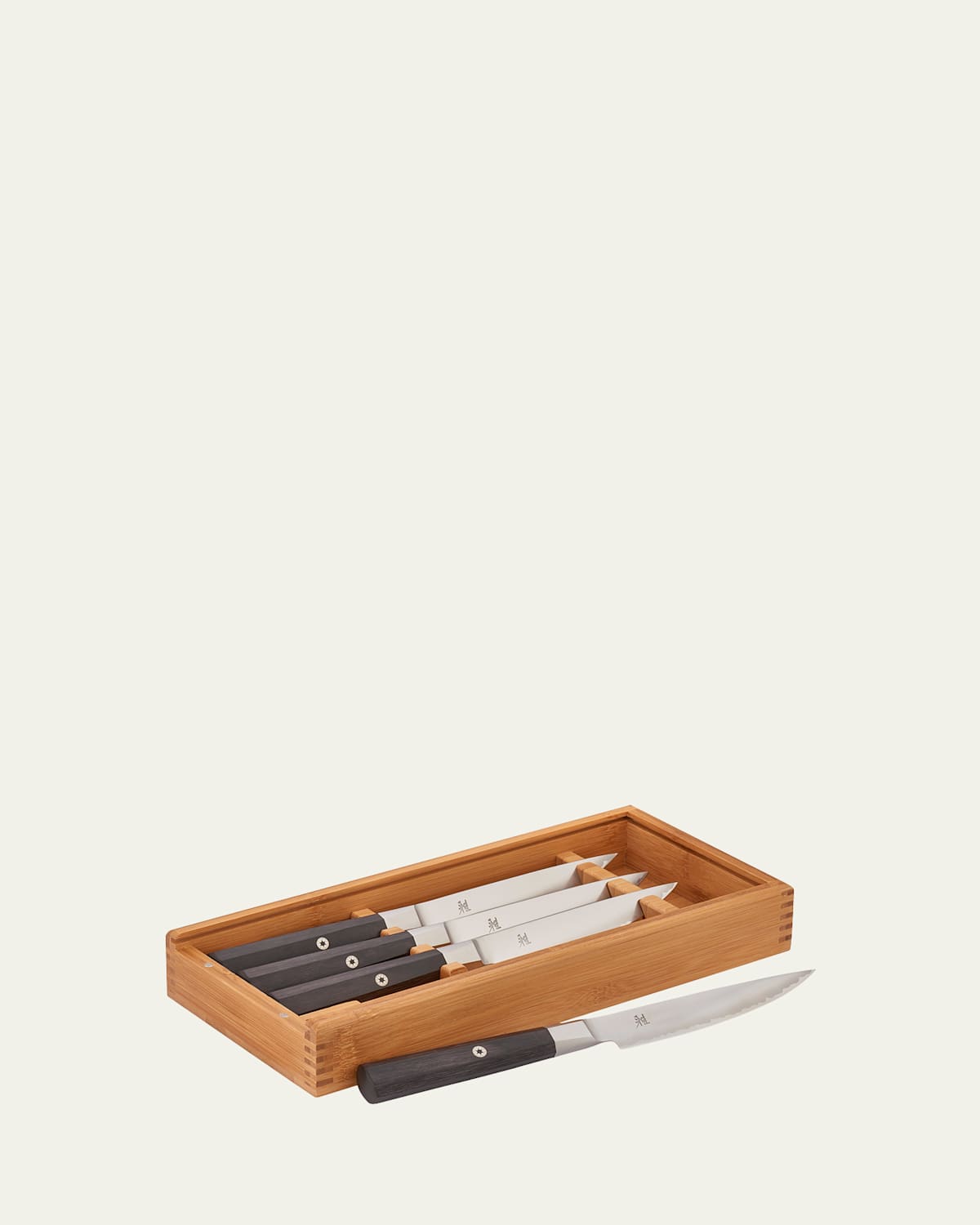 Handcrafted of evolutionary FC61 fine carbide stainless steel Icehardened RIODURx2 blade boasts exceptional durability, cuttingedge retention, and corrosion resistance Handhoned, 3step Honbazuke blade boasts scalpellike sharpness 61 Rockwell hardness Authentic, thin Japanese blade profile 9.512° edge angle Mirrorpolished blade features Japanese design details with a sandblasted katana edge and embossed logo Octagonshaped Pakkawood handle design nestles comfortably in the hand Block, approx. 13"L x 5.5"W x 3.5"T Item Weight (Lbs.): 2.0 4piece set Hand wash only Made in Seki, Japan