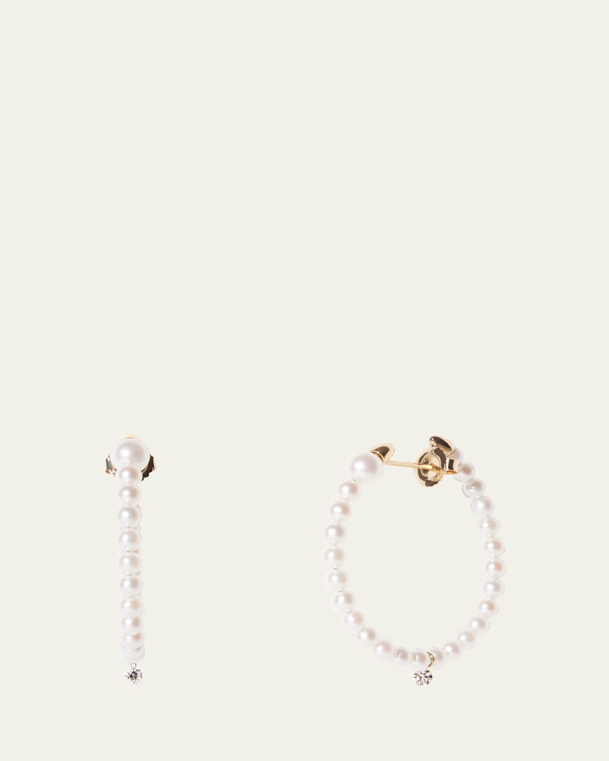 Akoya pearls are aligned to create these Mizuki hoop earrings. Hanging diamonds add a touch of colorless shine to these hoops. Polished 14karat yellow gold 0.16 total diamond carat weight Naturally white Akoya cultured pearls For pierced ears Imported