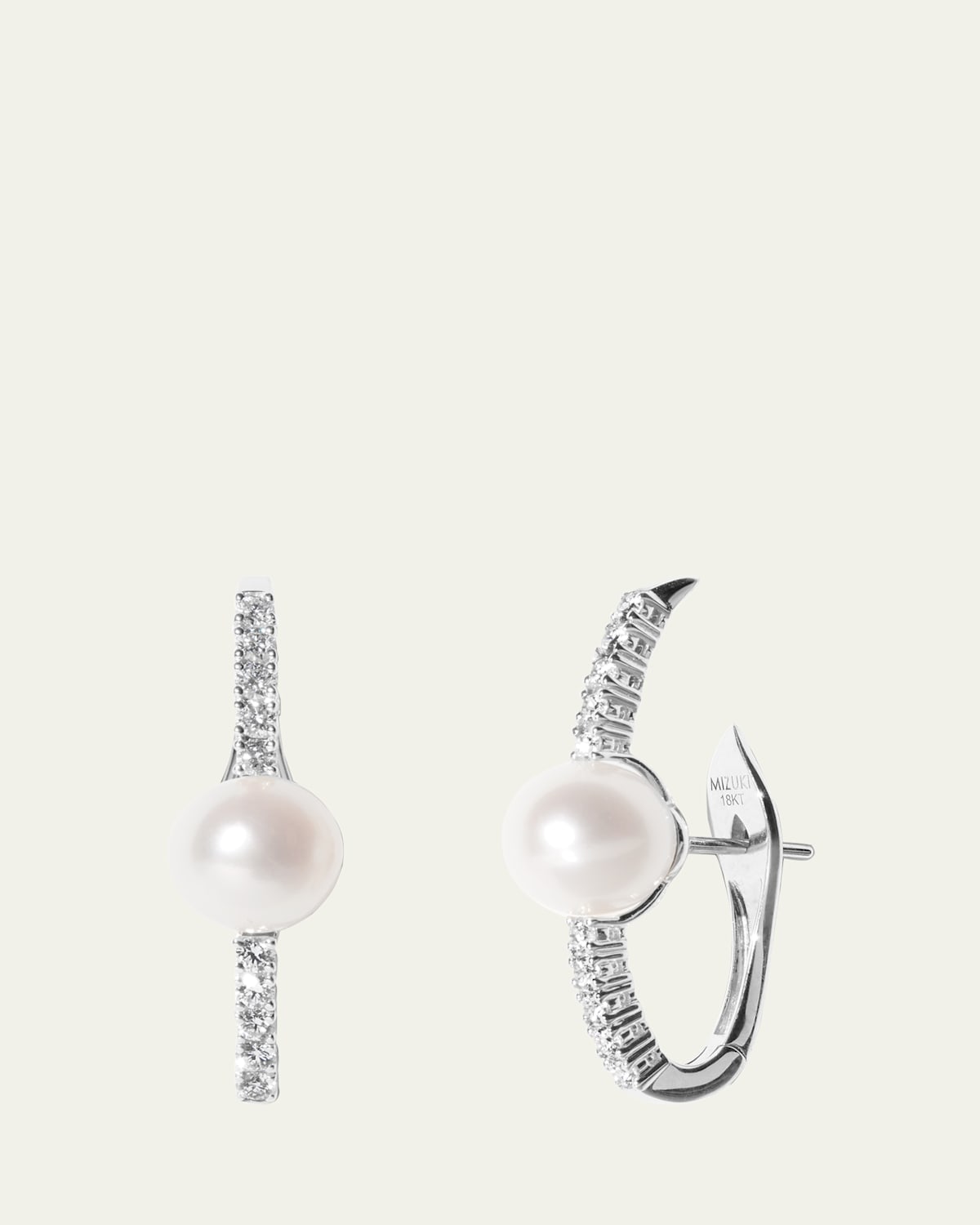 Precious diamonds and genuine pearls encompass the entire earlobe for these Mizuki earrings. The brilliance of these earrings will make a statement, no matter the occasion. Polished 18karat white gold G/VS diamonds; 0.6 total carat weight 8.5mm naturally white Akoya cultured pearls Leverback closure For pierced ears Imported