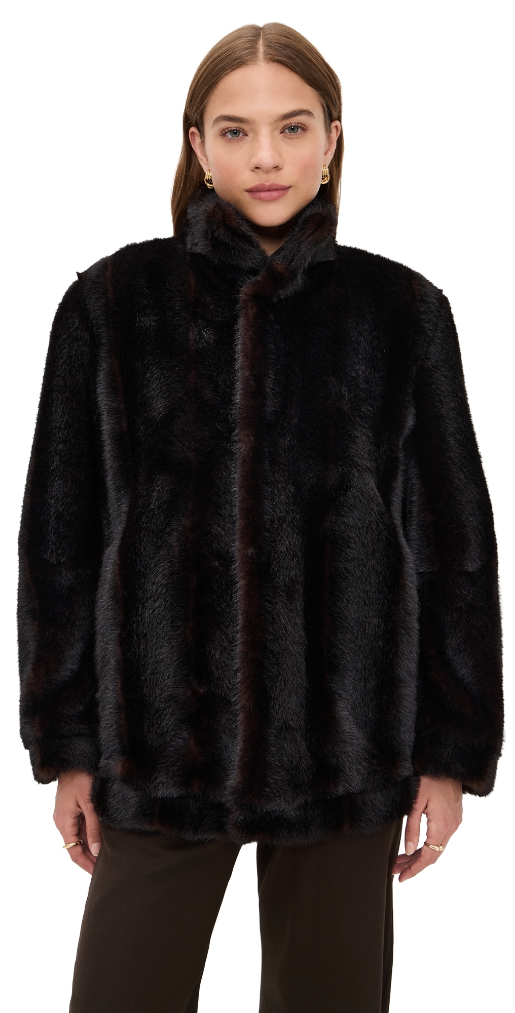 Fabric: Heavyweight, non-stretch faux fur. Shoulder pads. Mock neck. Long sleeves. Snap placket. Slant hip pockets. Shell: 100% polyester. Lined. Lining: 100% viscose. Dry clean. Made in Italy. Measurements: Measurements from size 36 Length: 28.25in / 72.0cm, from shoulder