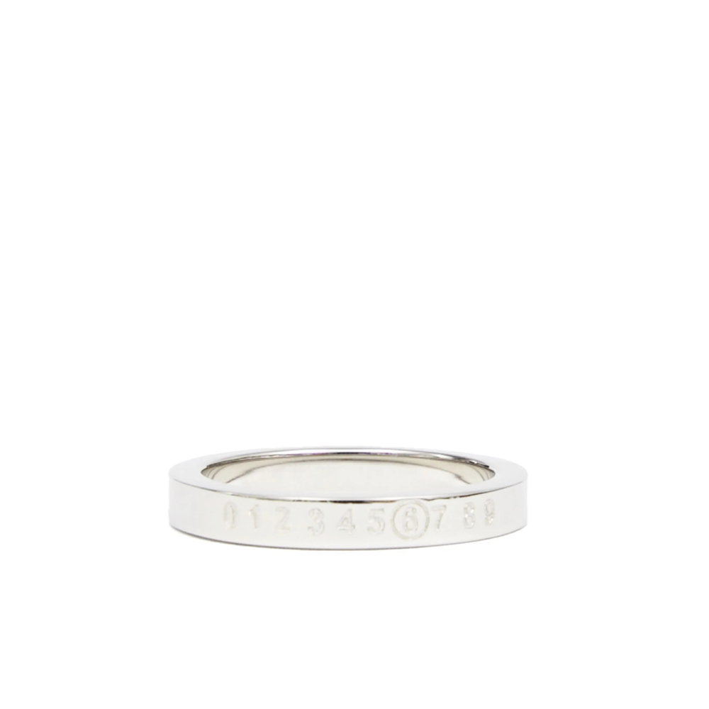 silver-tone polished finish engraved logo signature numbers motif flat band