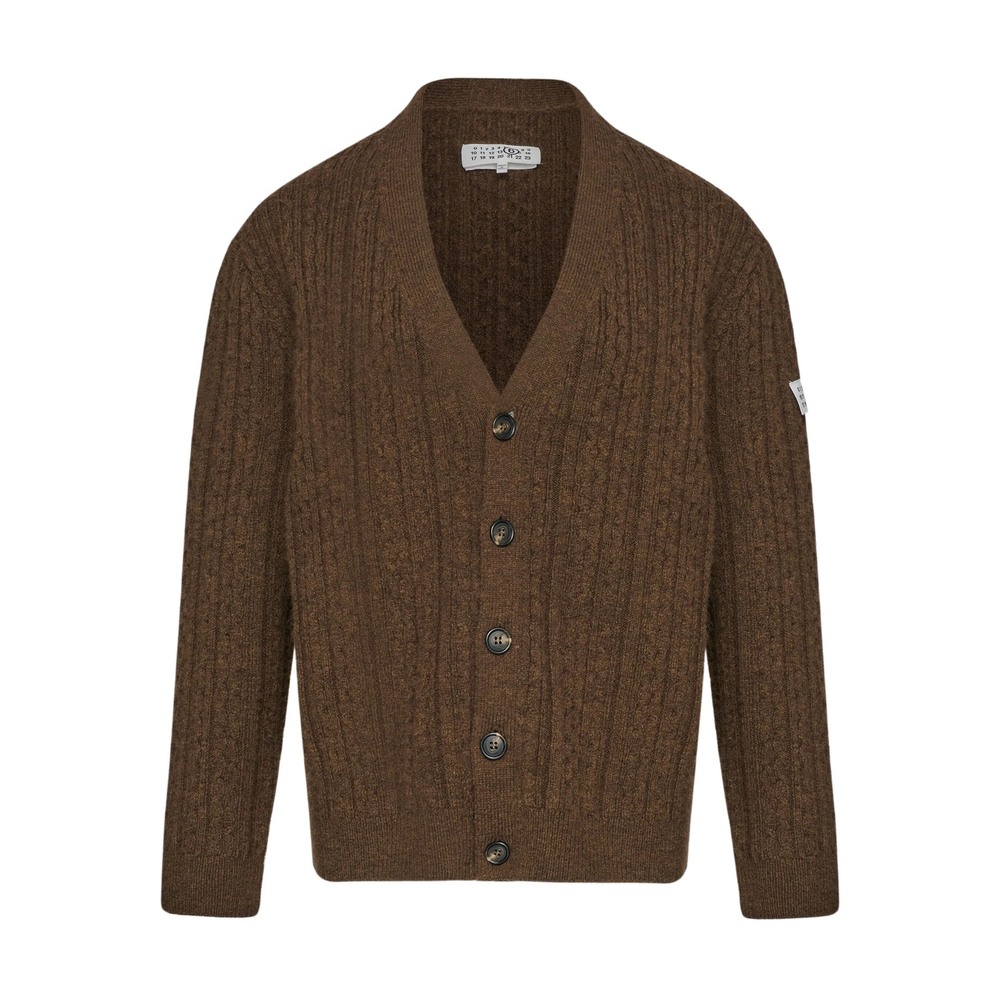 brown ribbed knit V-neck button fastening patch detail long sleeves