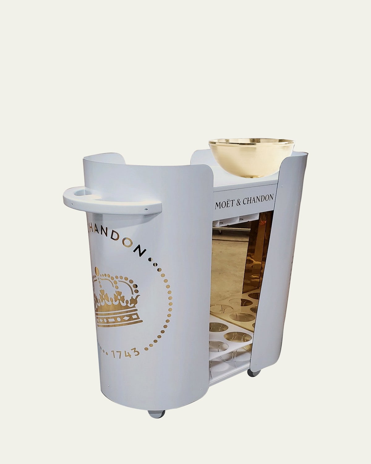 This rolling bar cart features two shelves with undershelf glass storage, bottle storage, and an ice bucket Highdensity polyethylene top, laminatecoated wood inner shelves, and acrylic glass bottle racks are finished with curved aluminum composite endcaps and a builtin handle The face of the top shelf can be personalized in the font and color shown (only available via phone order) Exterior endcap branded with mirrored gold vinyl logo Endcap interior wrapped with mirrored gold vinyl Four caster wheels to easily move around the home Recommended for indoor or covered outdoor use Approx. 37.5"L x 20.5"W x 39.5"T Item Weight (Lbs.): 90.0 Made in USA Boxed weight, approximately 200.0 lbs