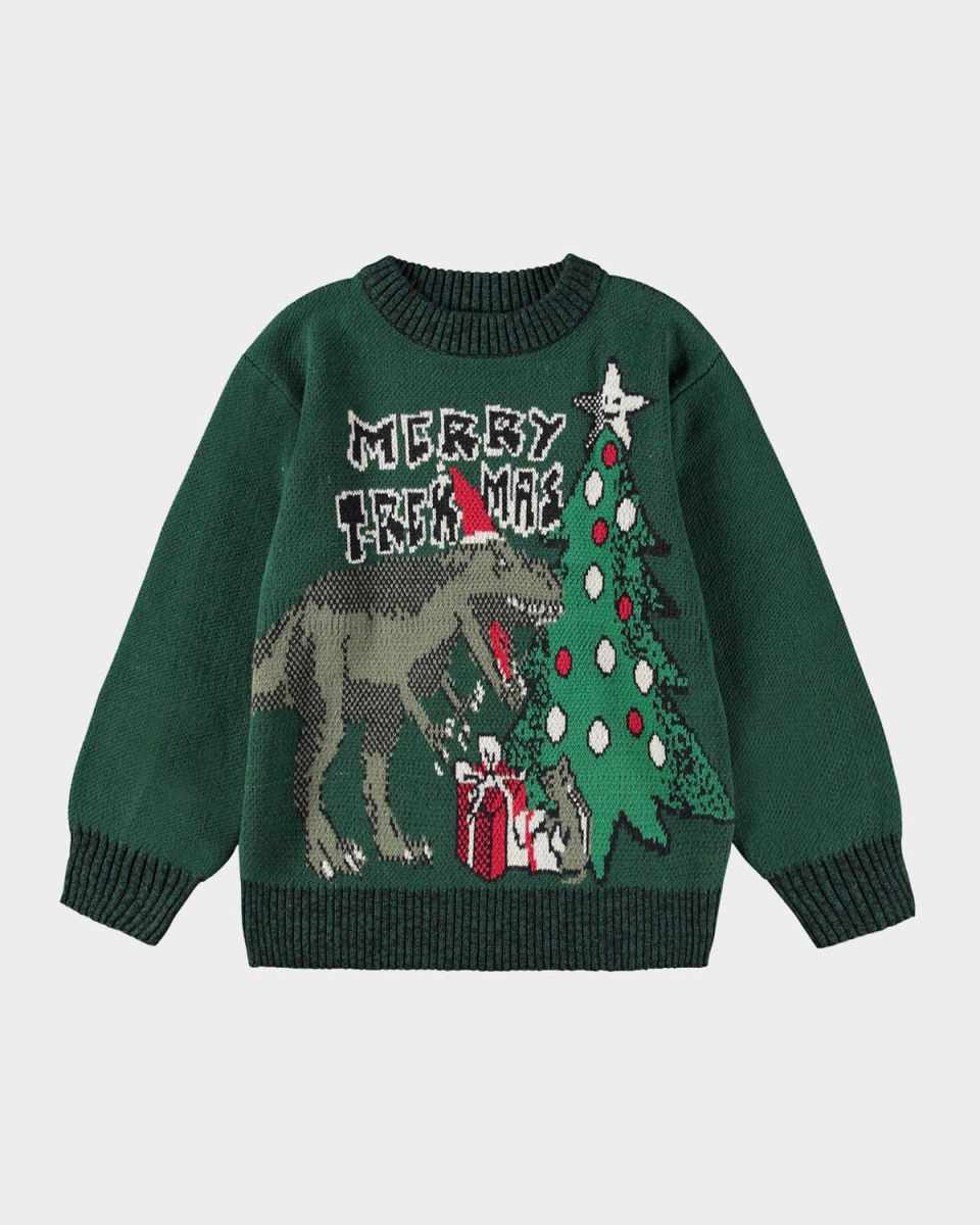 Molo "Bello" sweatshirt with a festive Trex intarsia graphic Crew neckline Long sleeves Banded cuffs and hem Ribbed trim Pullover style Cotton/acrylic Imported