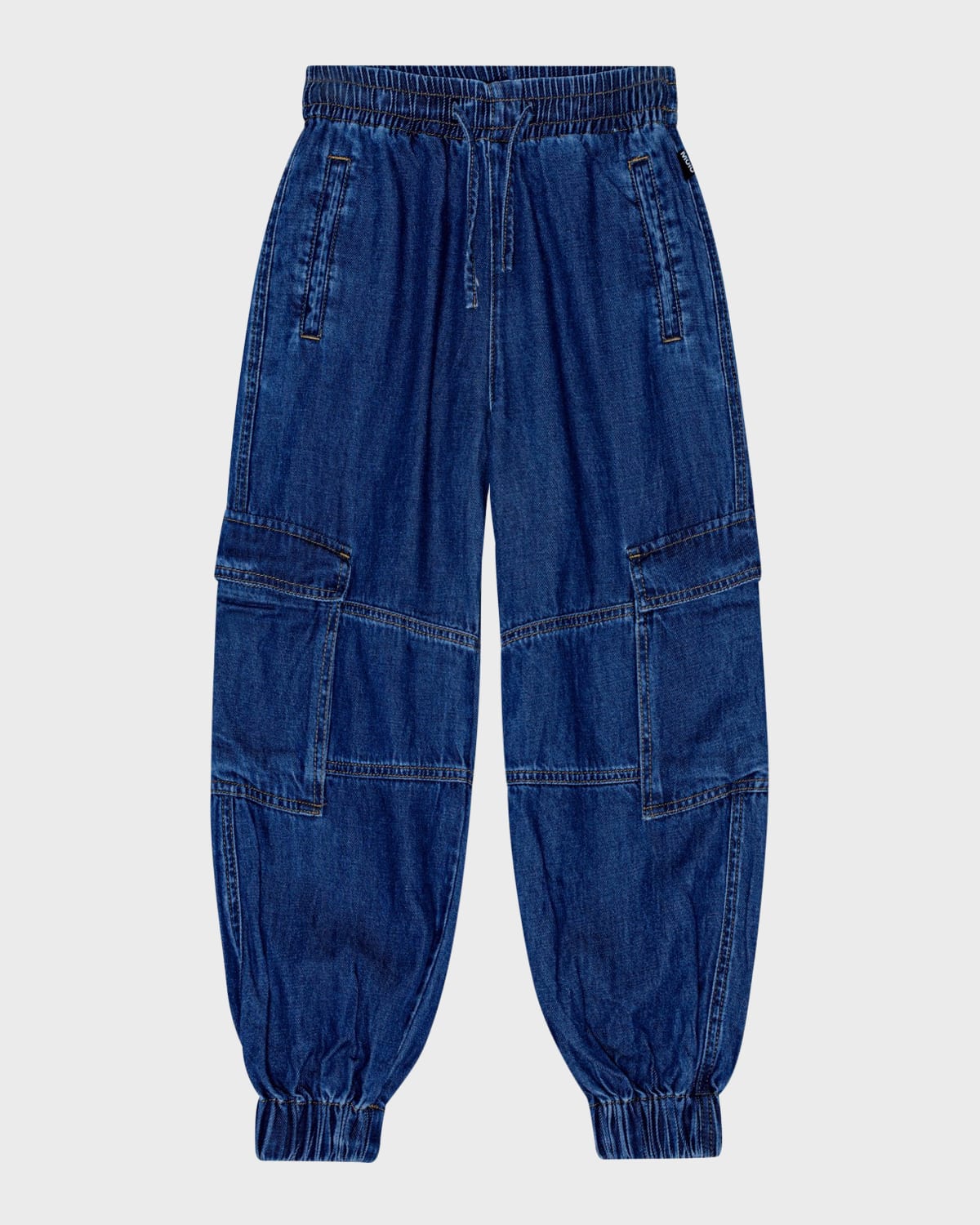 Molo "Aliki" denim cargo joggers Elasticized drawstring waistband Side slip pockets Flap pockets at sides Cropped at the ankle Relaxed fit Viscose/cotton Imported