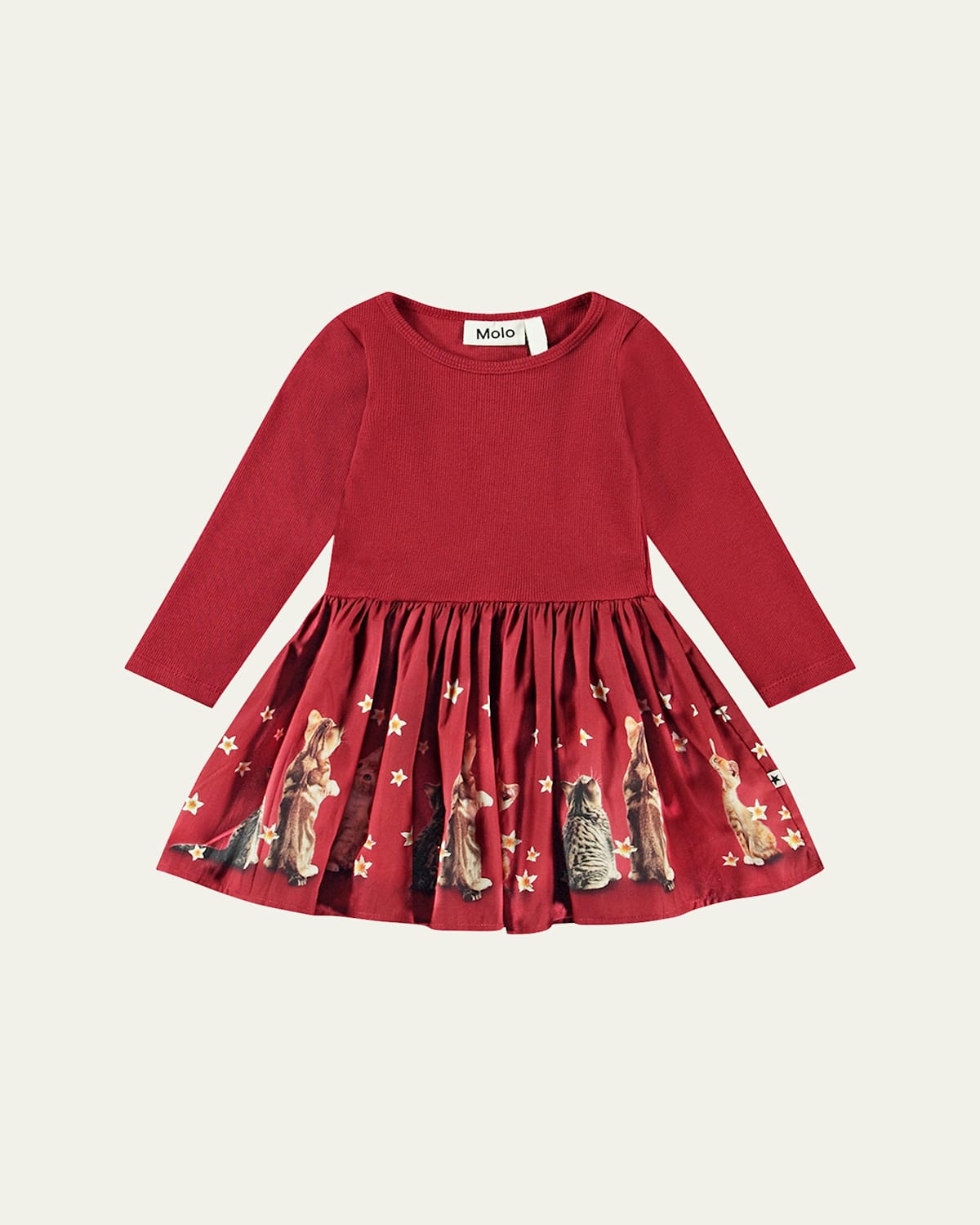Molo "Candi" combo dress with animal motif skirt Round neckline Long sleeves Empire waist Hem hits around the knee Aline silhouette Cotton Imported